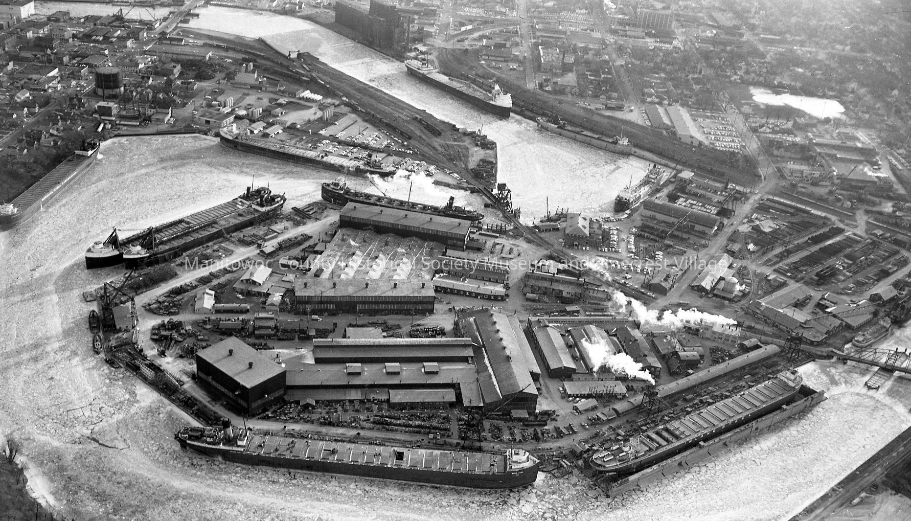 Aerial view of the winter fleet at Manitowoc Shipbuilding; 10 boats. Photograph taken on Deccember 21st, 1960.Made/Created