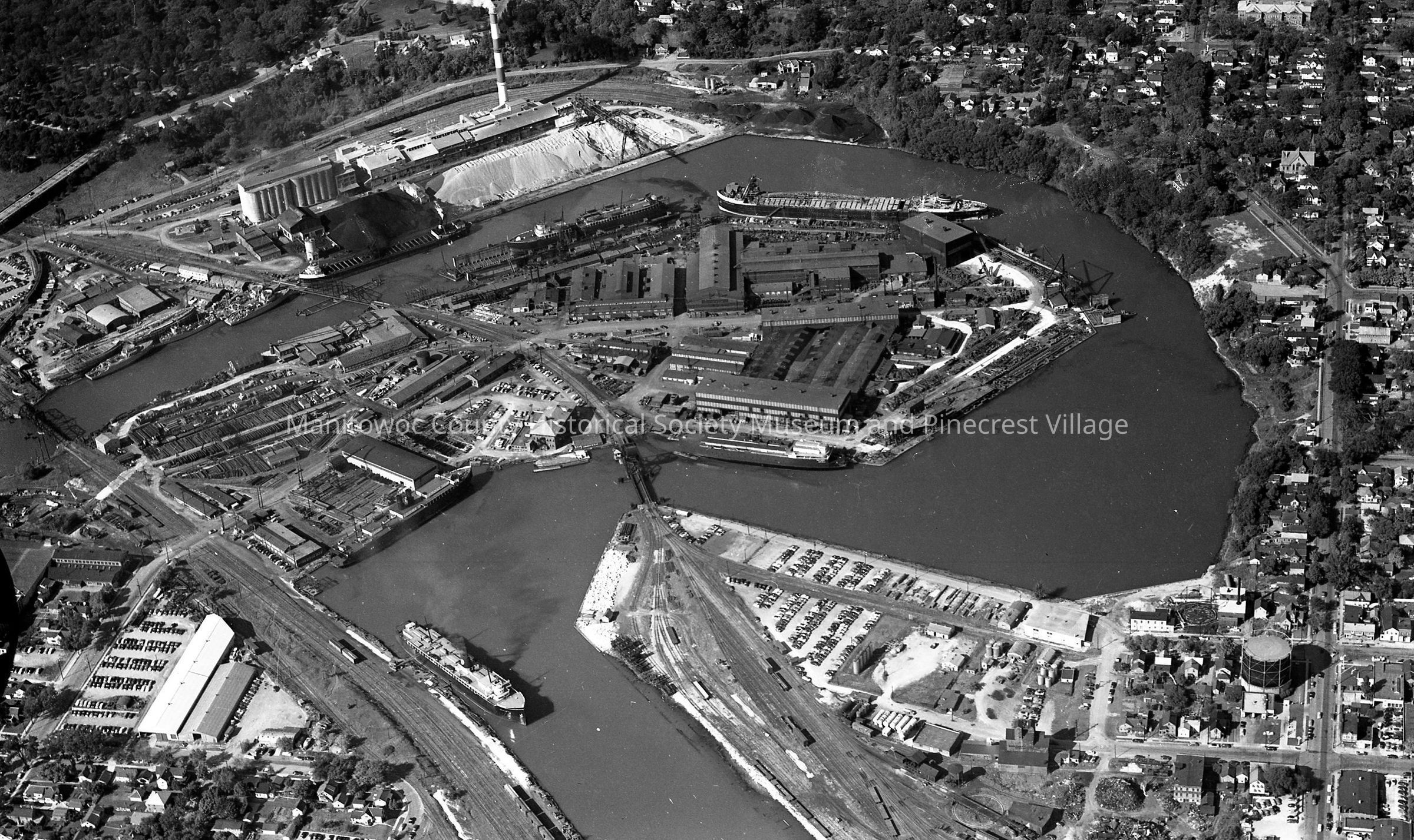 Aerial: Manitowoc Shipbuilding looking west. At left edge is Burger Boat, 1811 Spring Street with minesweepers. Next is Manitowoc Portland Cement with the "W.E. Fitzgerald" unloading stone. At shipbuilding is "Pere Marquette #21" is in dry dock being lenghtened; bow and bottom plates of "Detroit Edison" are being worked. At the jacknife bridgew is the carferry "Chief Wawatam" and on the other side of the bridge is "Ann Arbor #7" and "City of Flint".