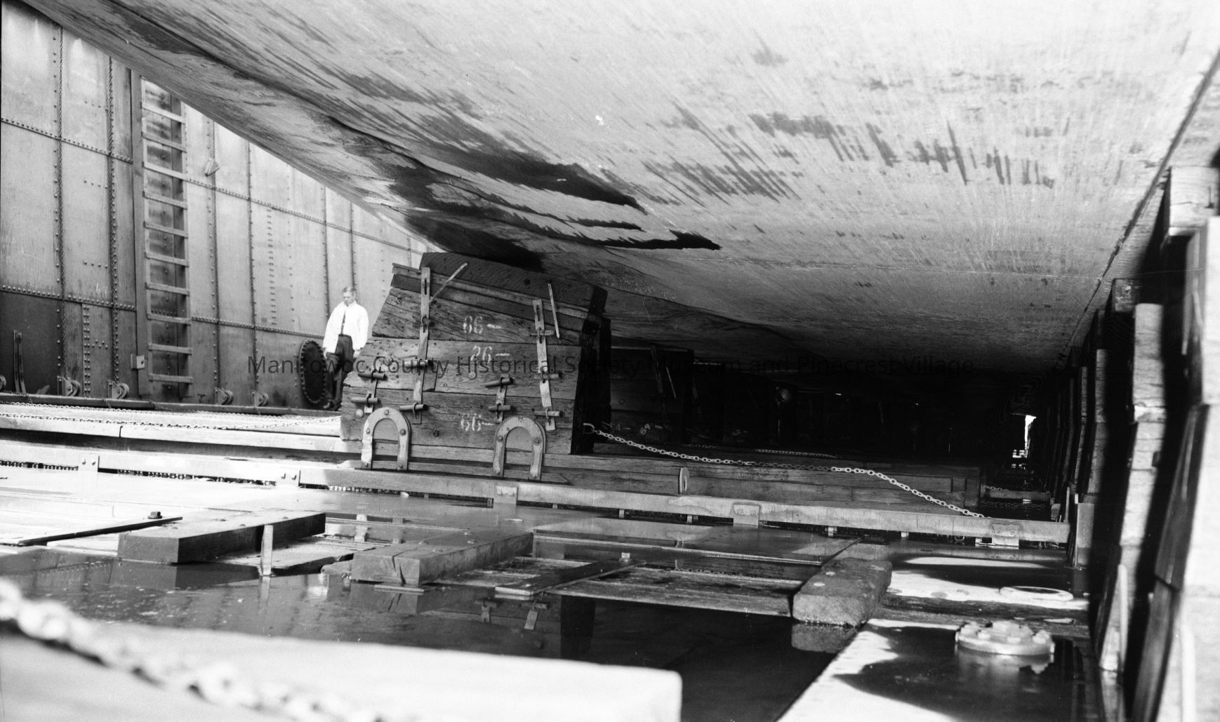 Manitowoc Shipbuilding Company; working under a boat in dry dock. Photograph taken on June 29th, 1960.Made/Created