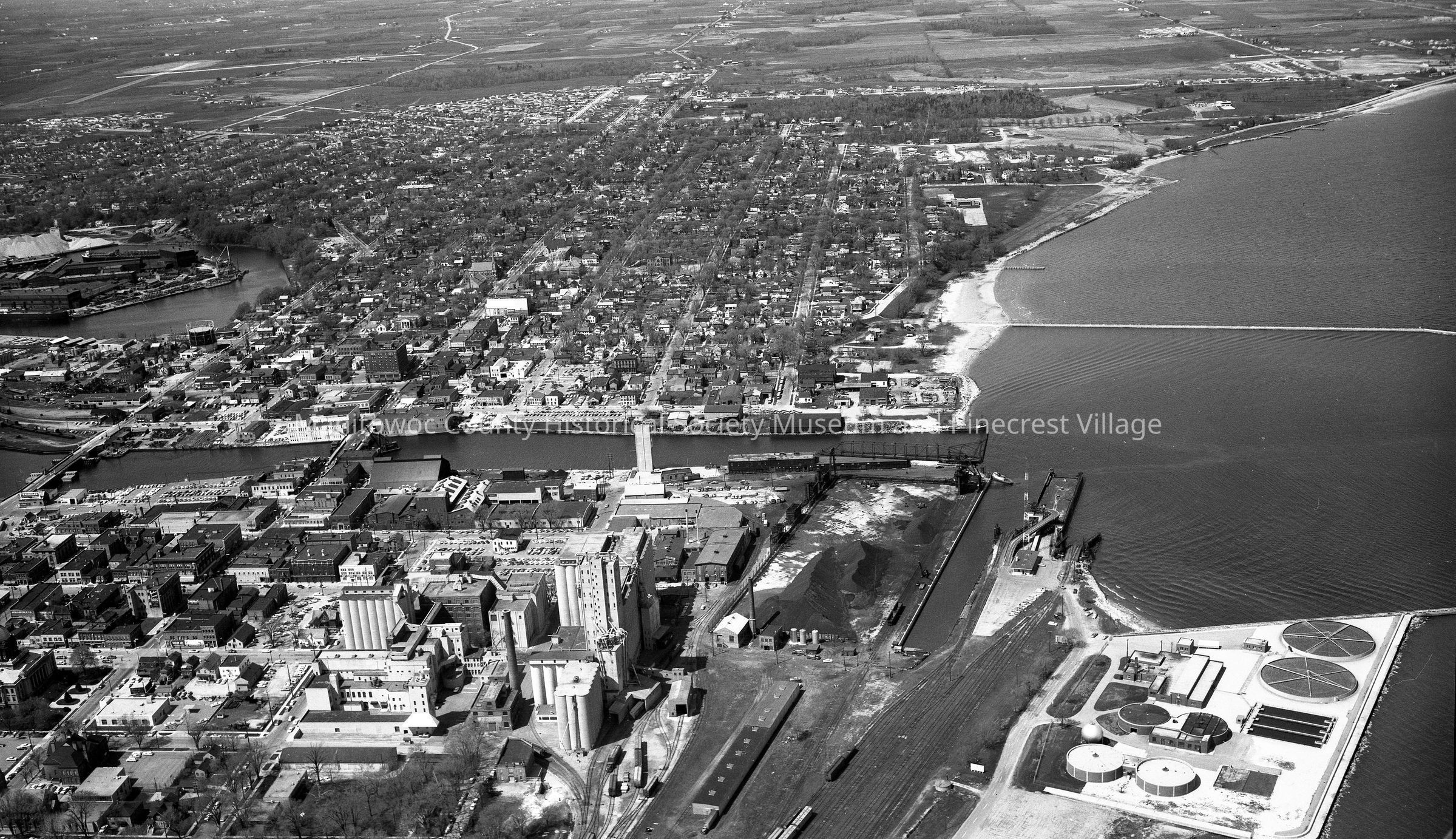 Aerial of Manitowoc southside lakefront, sewage treatment plant and carferry slip. Photograph taken in 1965.Made/Created