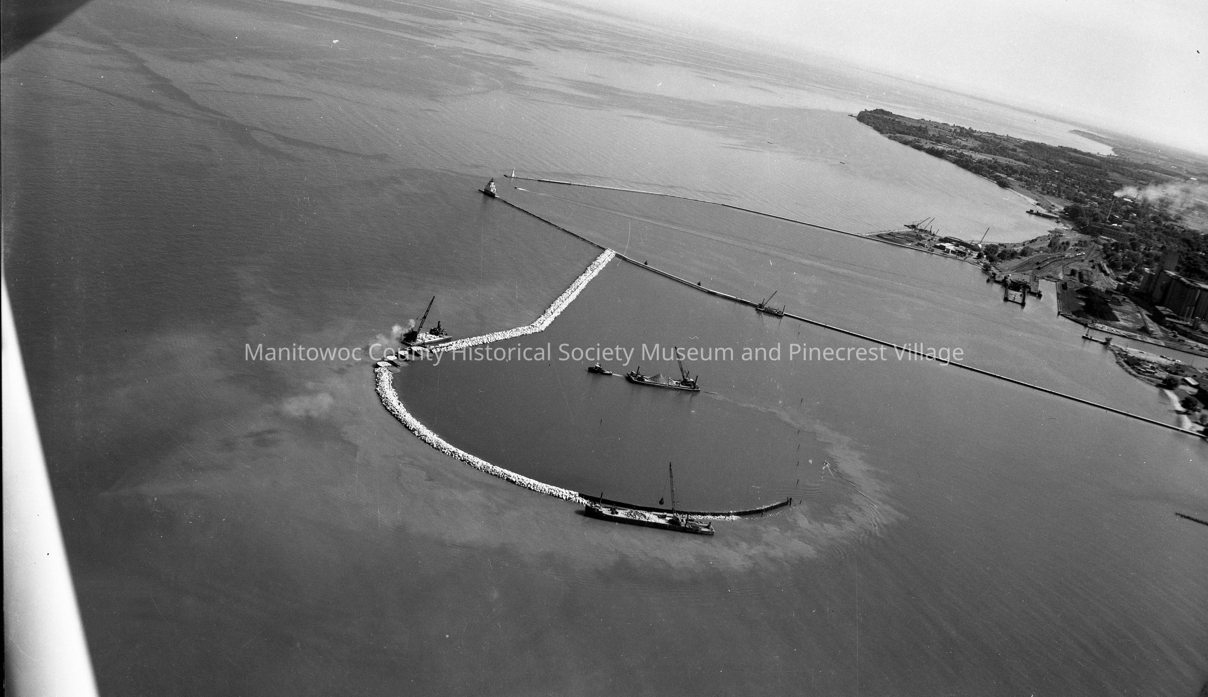 Aerial view of the start building containment area for new marina running off northside pier Manitowoc. Photograph taken on July 21st, 1975.Made/Created
