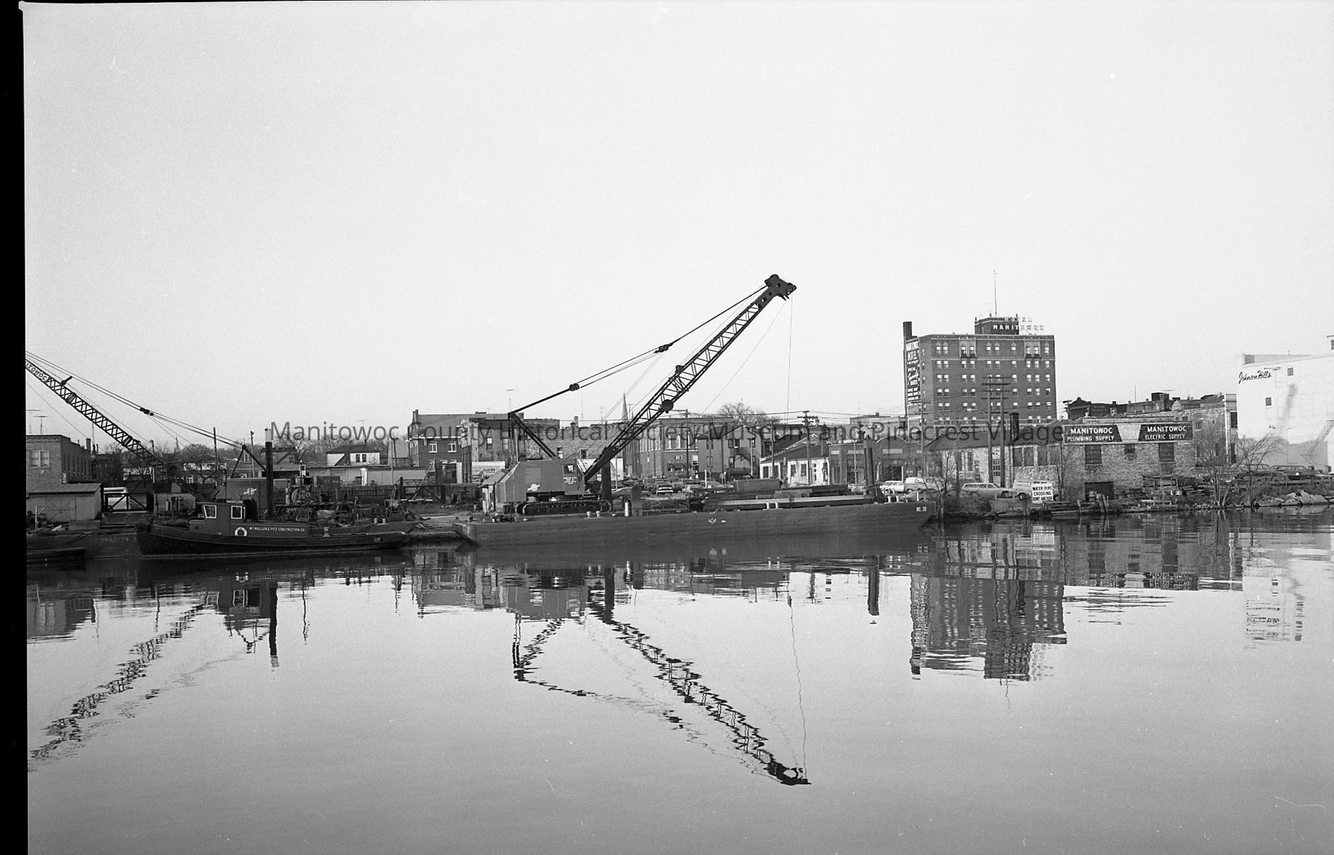 McMullen & Pitz construction yard, commercial street: looking from southside of Manitowoc River. At right is Manitowoc Plumbing & Electrical Supply, 825 Commercial Street