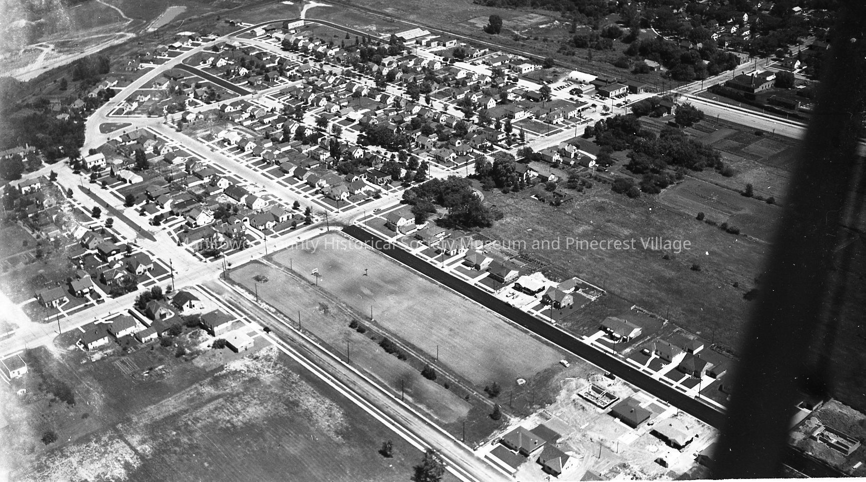 Aerial view of Manitowoc Meadow Lane from West Lawn Blvd. to C&NW RR tracks. At upper left is C&NW RR tressle over Manitowoc River. Big open lot at bottom center is where Bethany Luth. church will be built.