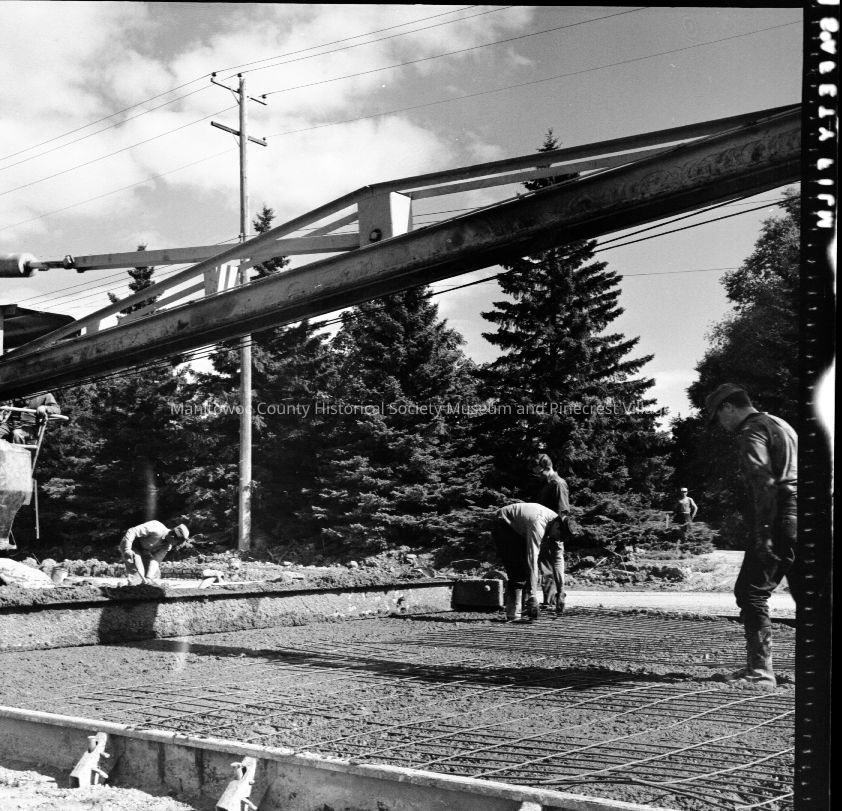 Memorial Drive; laying steel mesh before pouring cement for new road. Photograph taken in October 1962.