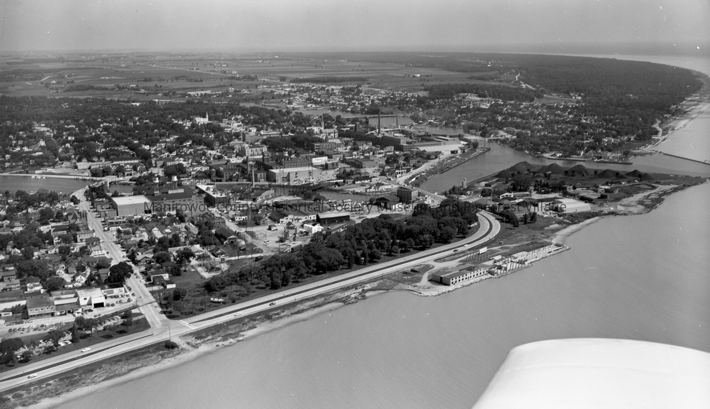 Aerial view of Two Rivers looking north. At left is intersection of Memorial Drive and Madison Street on lakefront. Carlton Inn being built. Photograph taken in July 1969.Made/Created