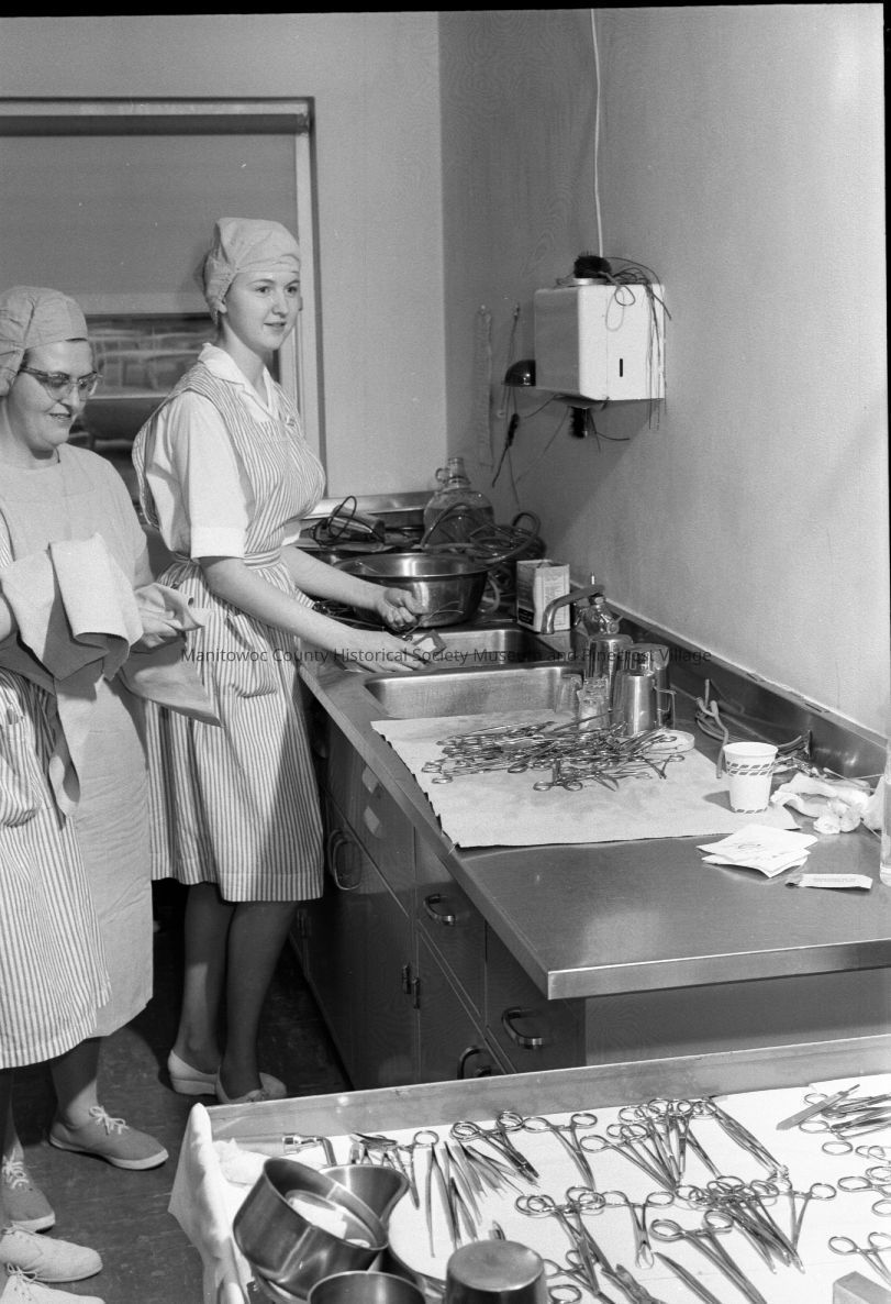 Memorial Hospital, 333 West Reed Ave Manitowoc; candy stripers (nurses' aides) sterilizing instruments. Photograph taken on December 29th, 1965.Made/Created