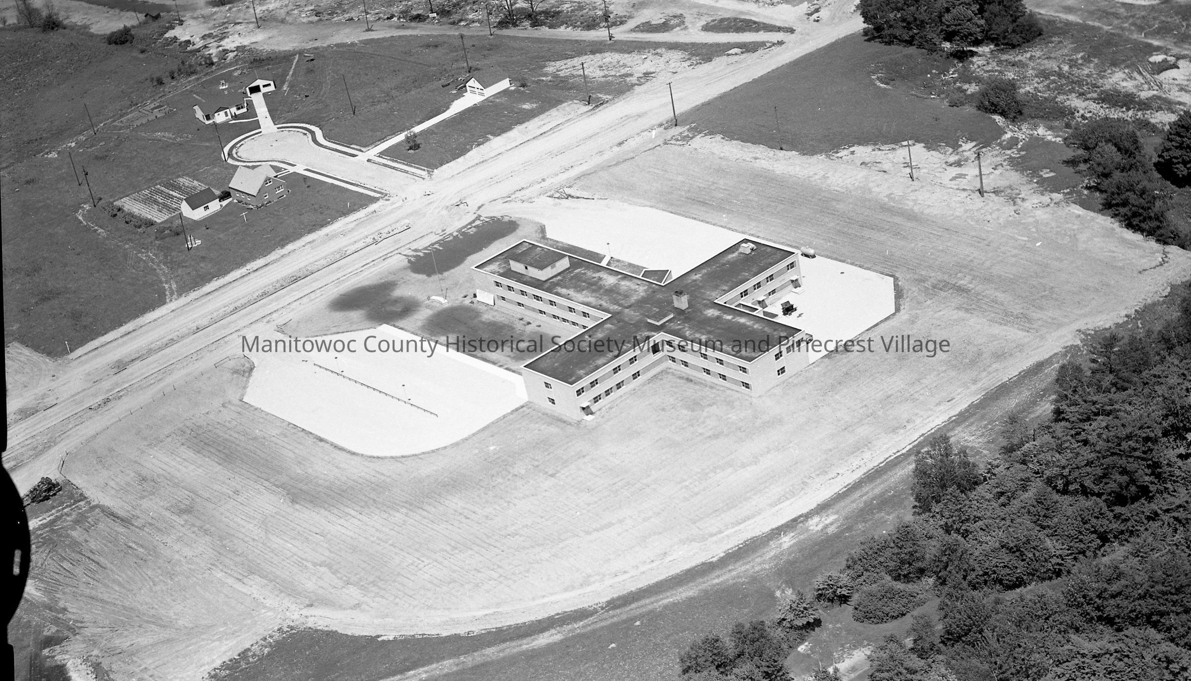 Aerial of Memorial Hospital, 333 Reed Ave. Street to left is North 2nd Street and City dump is at top just beyond the group of trees. Photograph taken on July 1st, 1953.Made/Created