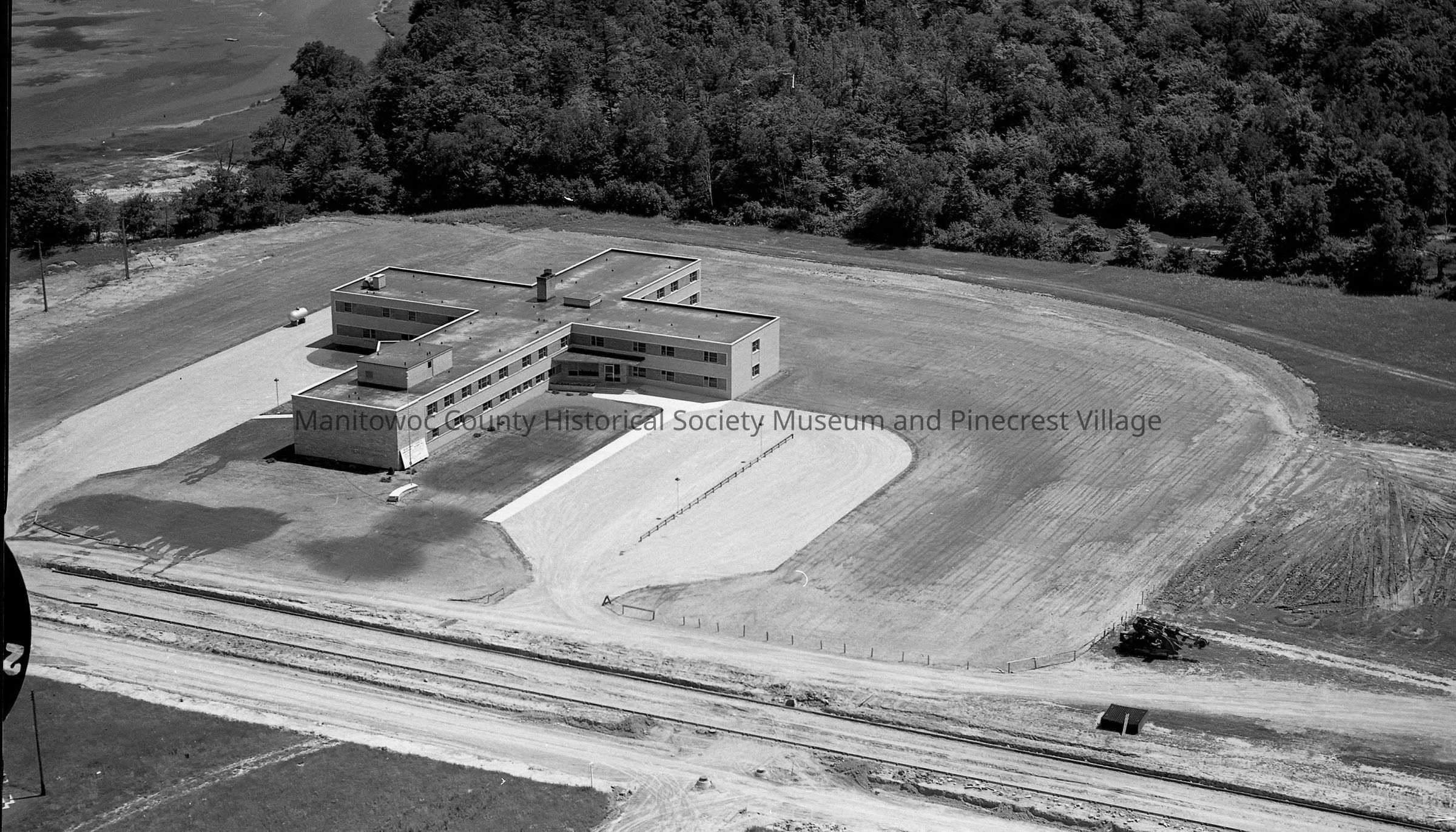 Aerial of Memorial Hospital, 333 Reed Ave. Wooded area is Lincoln Park and Little Manitowoc River is at upper left. Photograph taken on July 1st, 1953.Made/Created