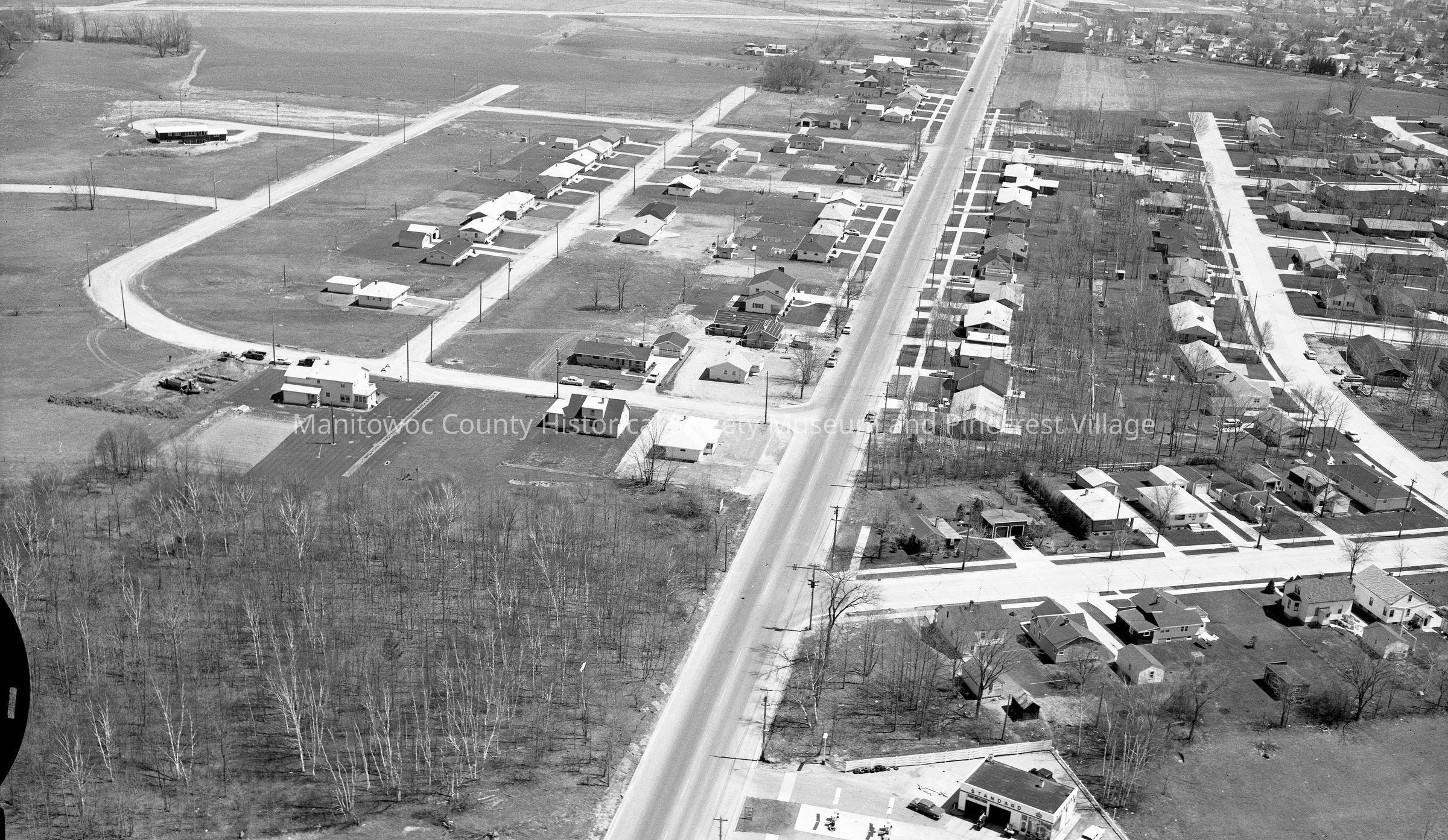 Aerial view of Menasha Ave looking east from North 24th Street Manitowoc. At bottom is Don Green Standard Station, 2315 Menasha Ave and the two streets upper left are Lexington and Richmond Ave. Photograph taken in August 1963.Made/Created
