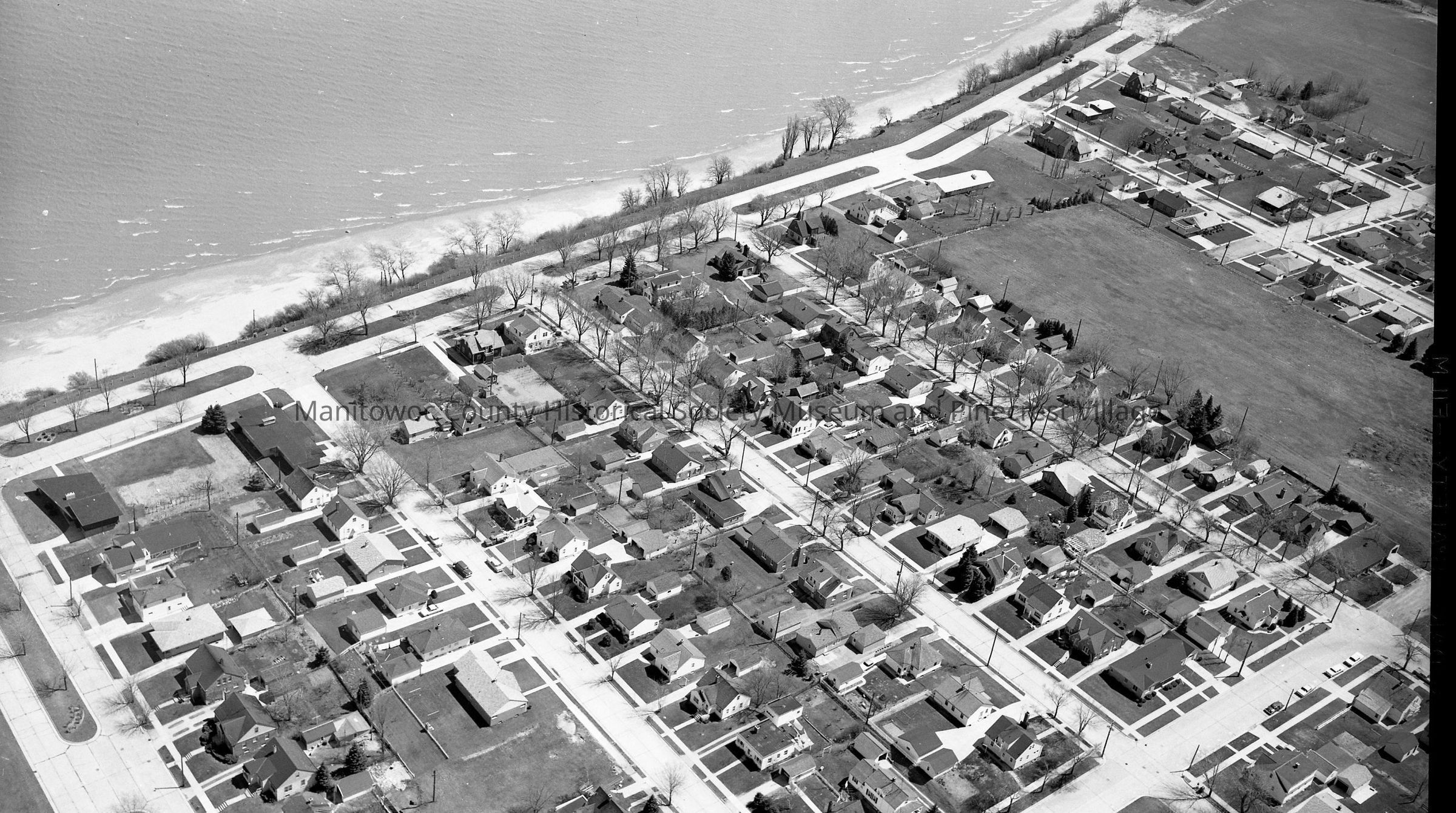Aerial: Michigan Heights Manitowoc. Streets from left to right are Dewey, Jackson, Summit, Wilson, Flambeau and Manitou. At bottom is South 9th street.