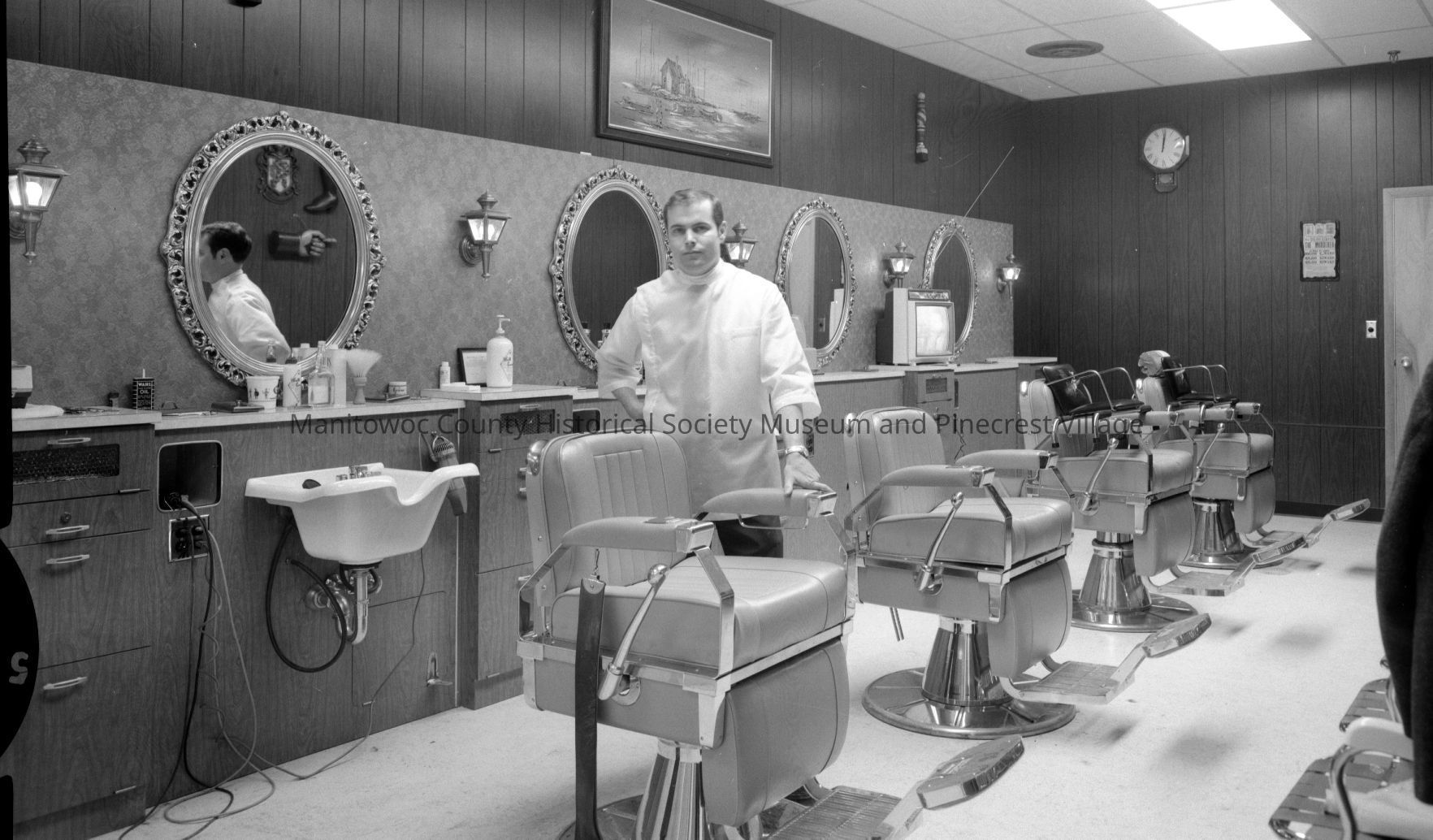 Mid-Cities Mall, 828 Memorial Drive Manitowoc; owner Jerry Lowney standing by chair in Mid-Cities Barbershop. Photograph taken on May 1st, 1968.Made/Created