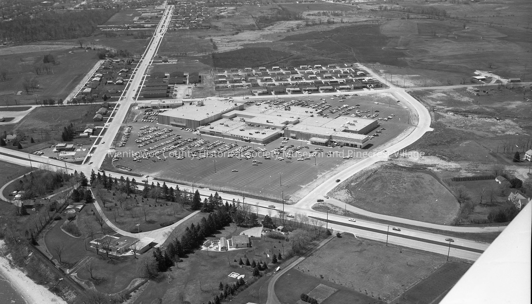 Aerial view of Mid Cities Mall, 828 Memorial Drive looking west. Street near bottom is Memorial Drive; street running east-west is Reed Ave. Homes at bottom left to right are Frank Kordecki, 827; John West, 915; Glenn Gaterman, 1005; Henry Wage, 1015 and Wm. Randolph, 1021 Mermorial Drive.