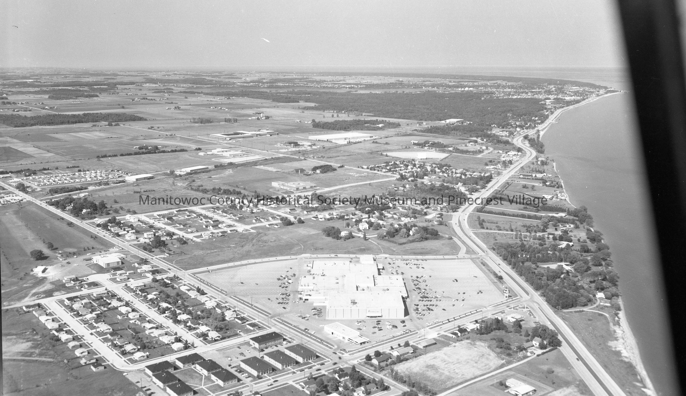 Aerial view of Mid-Cities Mall Manitowoc. Left is Johnson Drive and Reed Ave apartments; short Elder & Daisy Streets. Further up Johnson Drive is Meadow Lanes North bowling alley, 1540 Johnson Drive along with Lincoln Fields golf course. Photograph taken on July 21st, 1975.Made/Created
