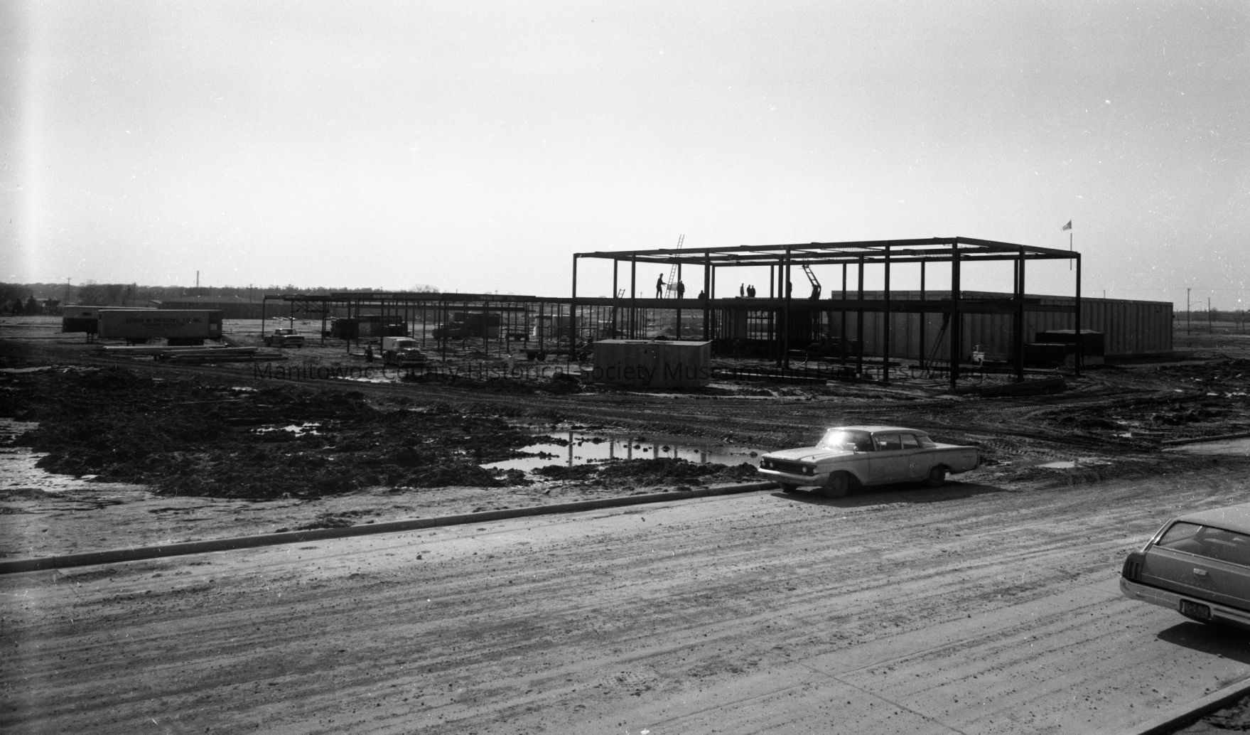 Mid-Cities Mall, 828 Memorial Drive Manitowoc - looking south from near East Magnolia and Holly Street at construction. Big steel frame will be Montgomery Ward Auto. Photograph taken on April 7th, 1967.Made/Created