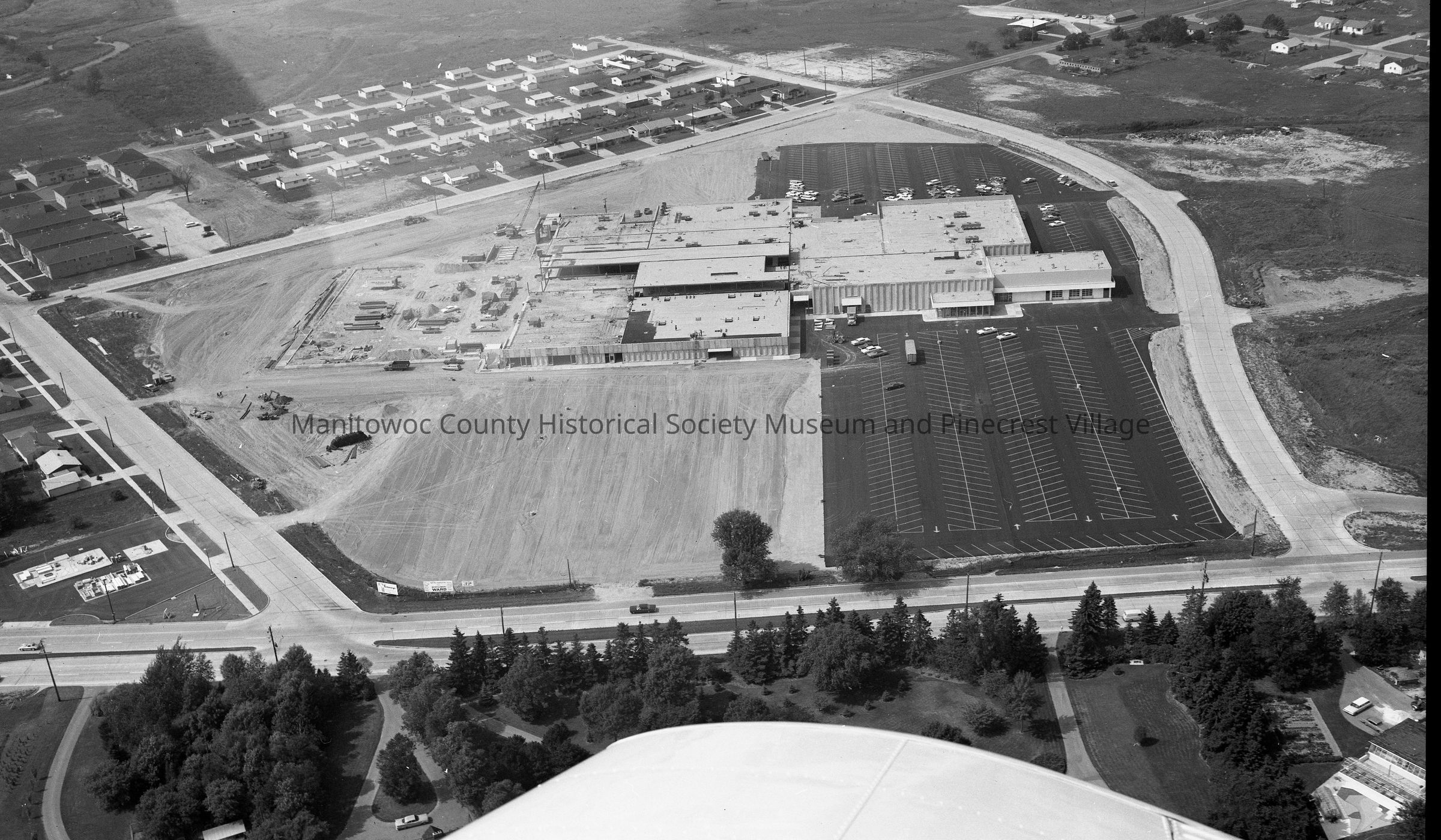Aerial of the Mid-Cities Mall, Memorial Drive, being built. Street at right is East Magnolia and left is East Reed Ave. Upper left corner is Reed Ave apartments, corner of Johnson Drive & East Reed Ave. Photograph taken on September 9th, 1967.Made/Created