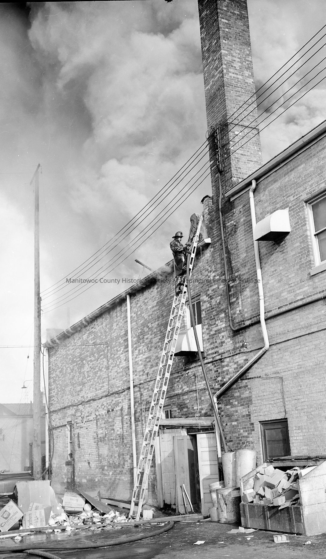 Mikadow theater fire, 1116 Washington Street Manitowoc. Firefighters on ladders from rear parking lot. Photograph taken on June 11th, 1956.Made/Created