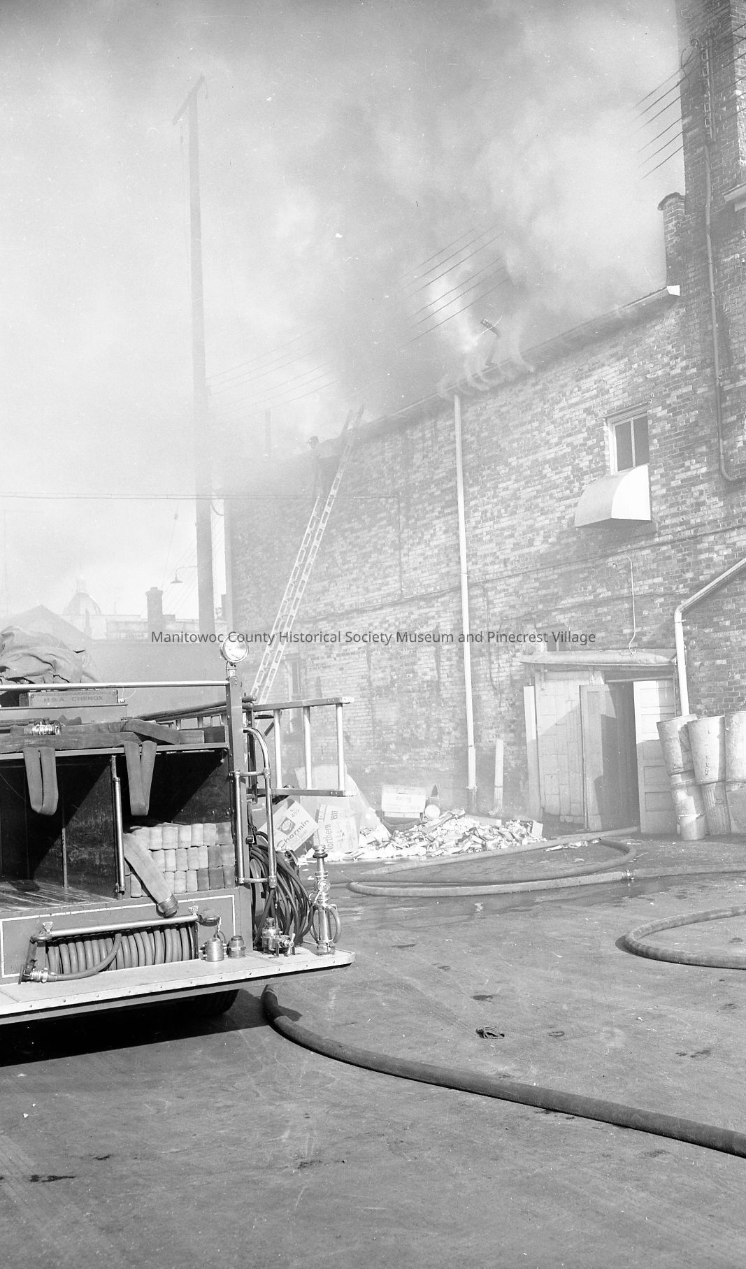 Mikadow theater fire, 1116 Washington Street Manitowoc. Left bed of pumper hose is empty and half of right bed is out to fight fire. Photograph taken on June 11th, 1956.Made/Created