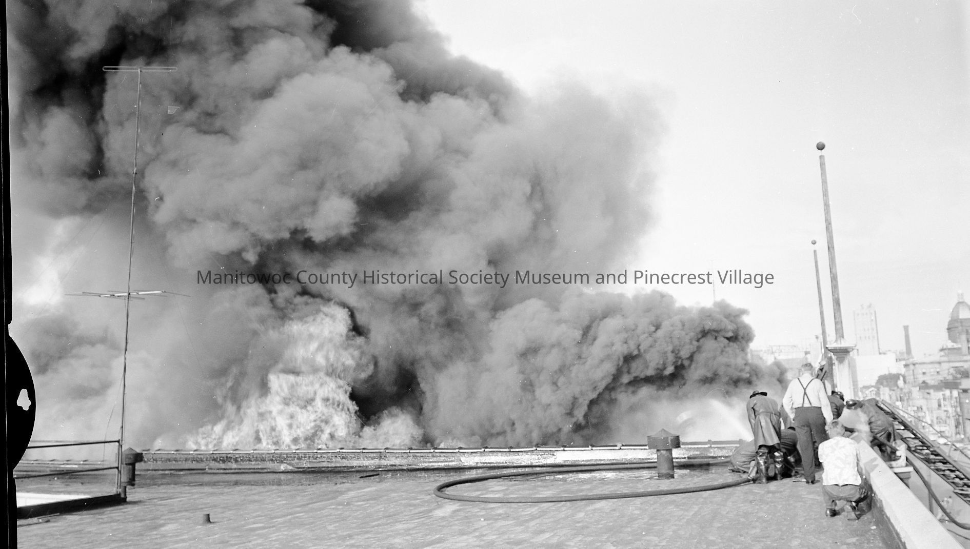 Mikadow Theater fire, 1118 Washington Street Manitowoc. Roof colapsing as firefighters work from roof of WOMT & A&P supermarket looking east. Photograph taken on June 11th, 1956.Made/Created