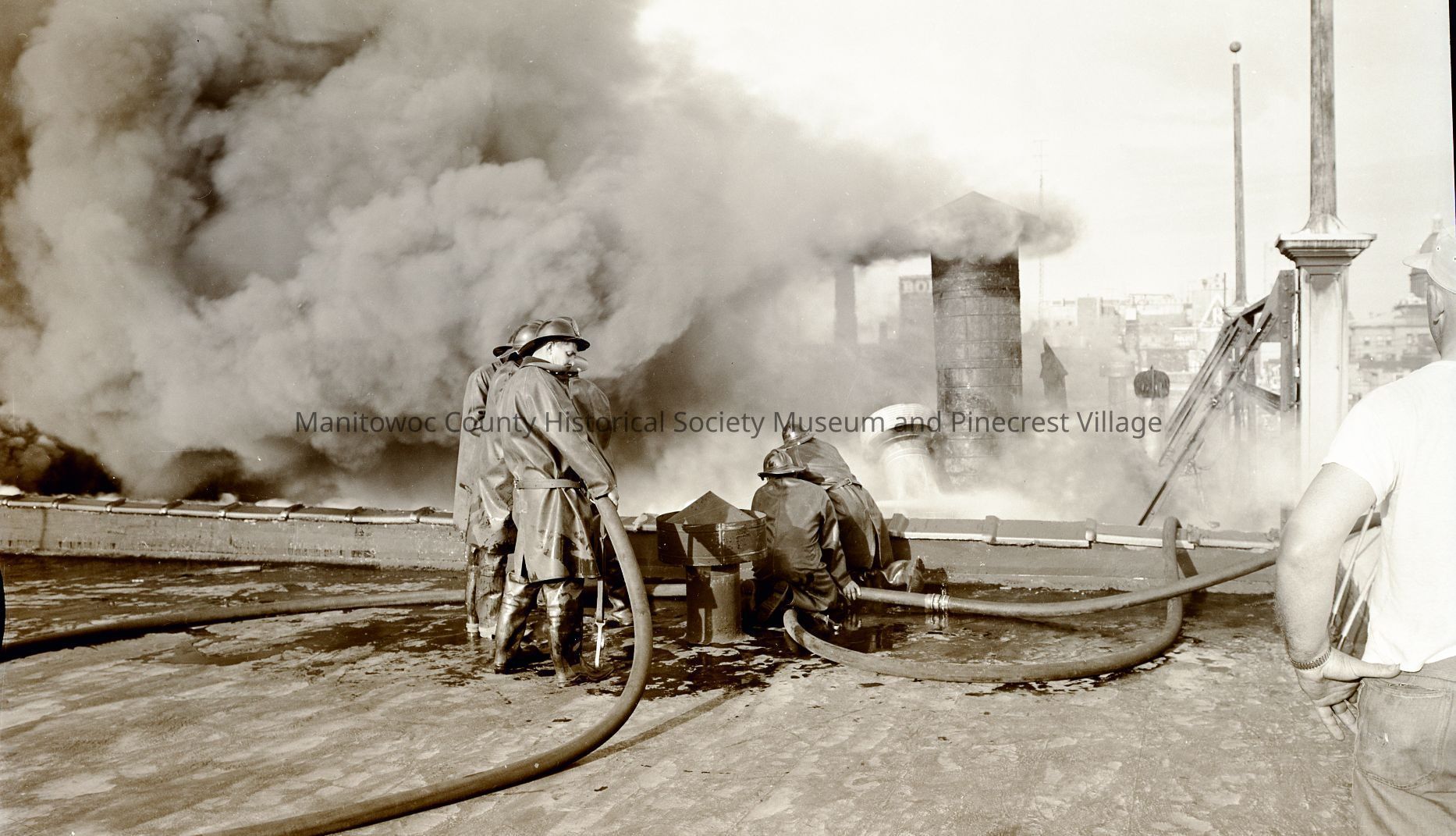 Firefighters fighting Mikadow Theater fire from roof of WOMT and A&P supermarket. Theater roof starting to let go; air vent is leaning. Photograph taken on June 11th, 1956.Made/Created