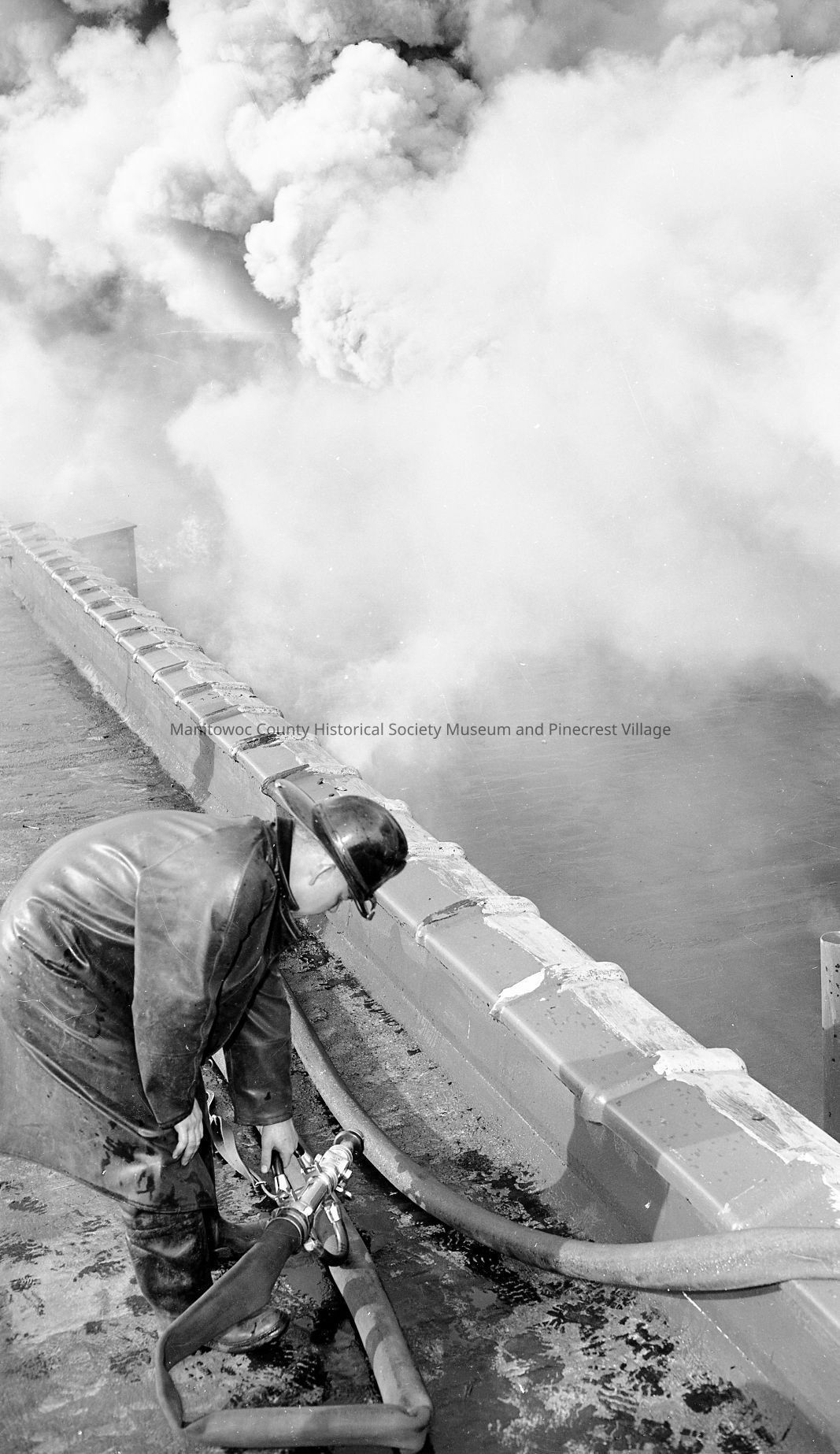 Mikadow theater fire, 1118 Washington Street Manitowoc. Working from roof of WOMT & A&P supermarket; theater roof has collapsed. Photograph taken on June 11th, 1956.Made/Created