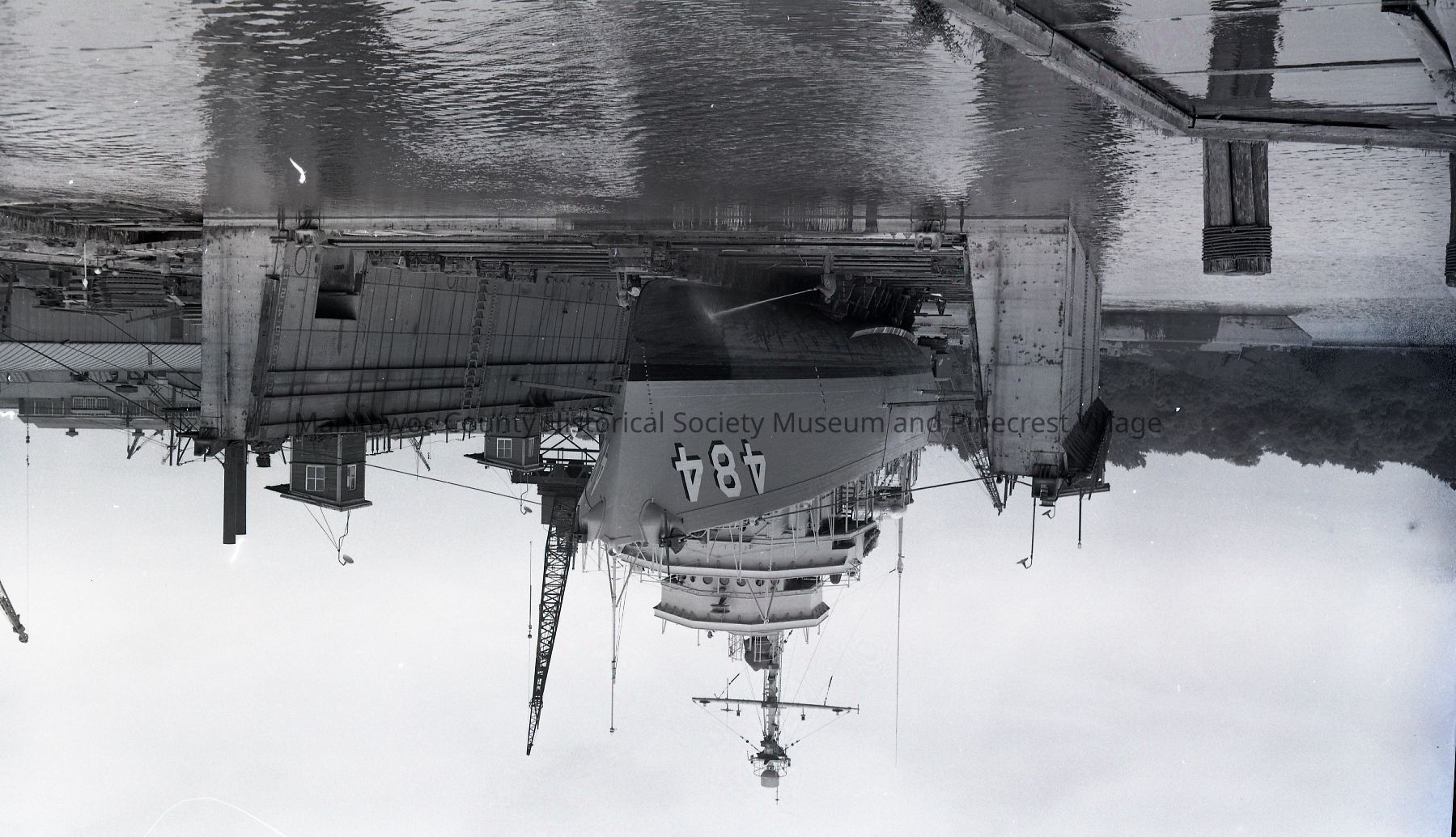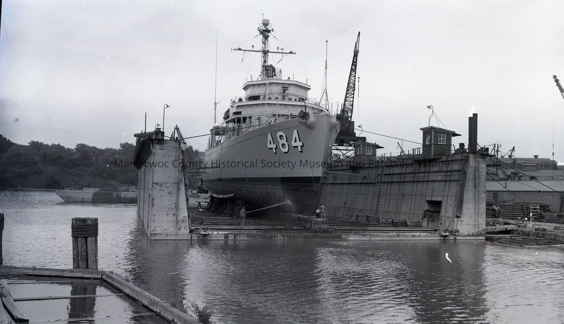 Minesweeper 484 in Manitowoc Shipbuilding dry dock. She was built at Burger Boat. Photograph taken on July 20th, 1954.Made/Created