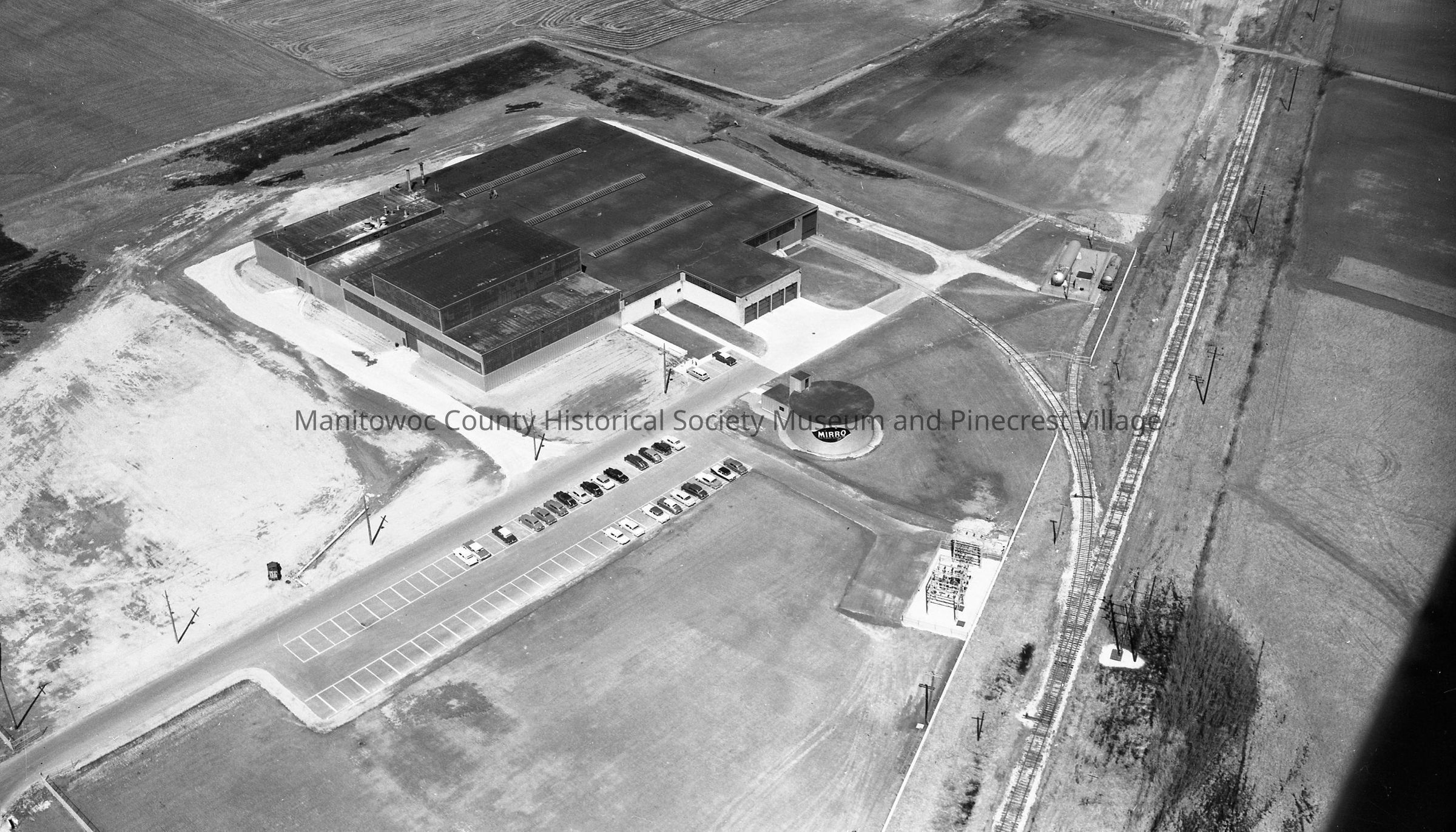Aerial of new Mirro Aluminum plant #5 on Mirro Drive. The RR line is the C&NW branch to Two Rivers, known as the Snow Flake Limited Line. Photograph taken on April 30th, 1957.Made/Created