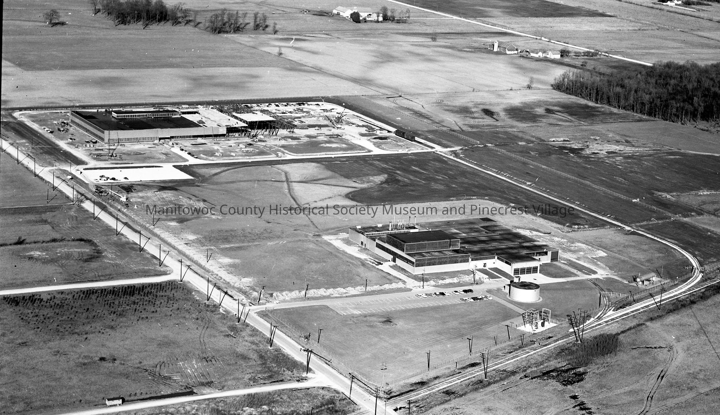 Aerial of Mirro plant #5 & #6 on Mirro Drive. Building at lower right is WCUB radio station, 2500 Mirro Drive. Photograph taken on November 17th, 1958.Made/Created