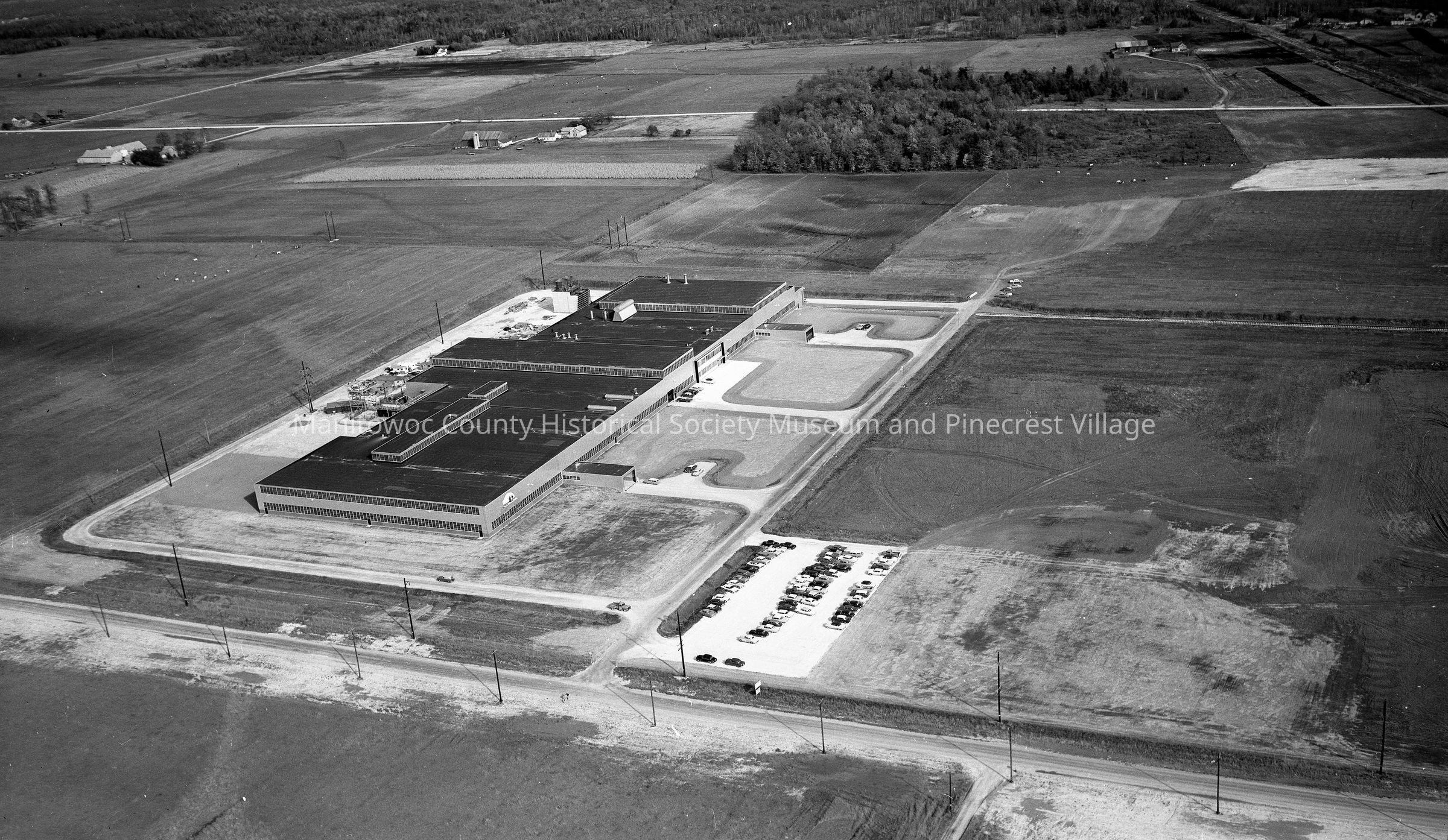 Aerial view of Mirro plant #6, rolling mill on Mirro Drive Manitowoc looking at the front. Photograph taken on October 20th, 1959.Made/Created