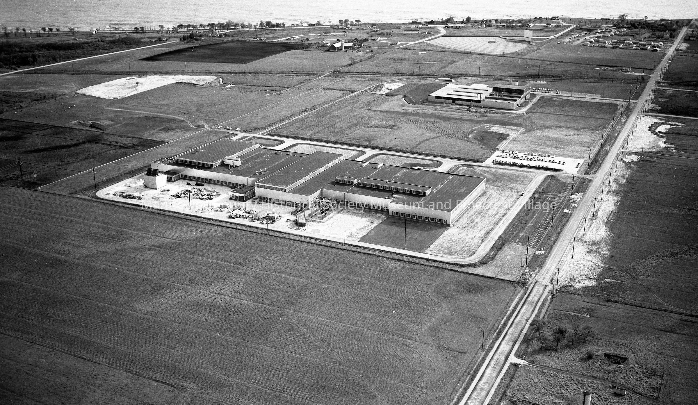 Aerial view of Mirro plant #6, rolling mill on Mirro Drive Manitowoc. Plant #5 is above and left of Mirro Drive. Photograph taken on October 20th, 1959.Made/Created
