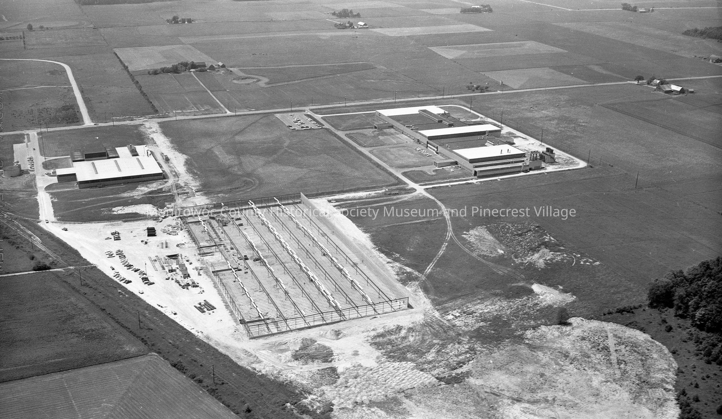 Aerial view of steel framing for new Mirro plant #7, the shipping terminal on Mirro Drive Manitowoc looking west. Plant #5 is at left and plant #6, rolling mill is at right. Photograph taken on July 16th, 1963.Made/Created