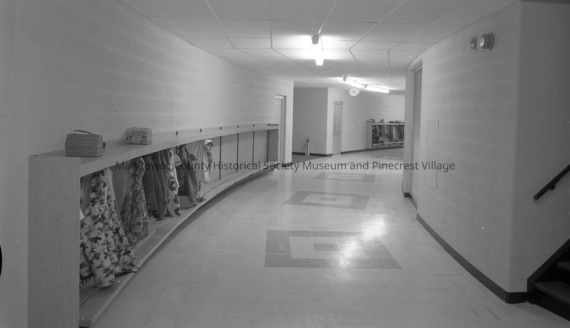 Hall and jacket storage at Mishicot elementary school. Stairs at right go to stage in gym. Photograph taken on October 26th, 1965.Made/Created