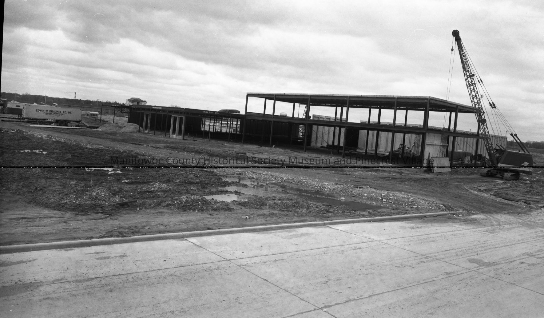 Mid-Cities Mall, 828 Memorial Drive Manitowoc; Manitowoc 2300 crane doing work on Montgomery-Ward Auto Center, looking from East Magnolia Ave. Photograph taken on April 22nd, 1967.Made/Created