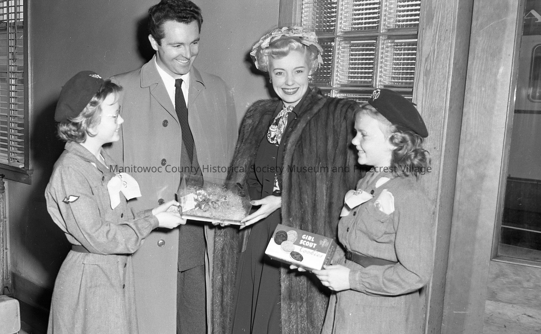 Movie Star Mary Beth Hughes & David Street greeted by girl scouts Emily Hagen & Sally Murphy HTR April 12, 1950 page 1