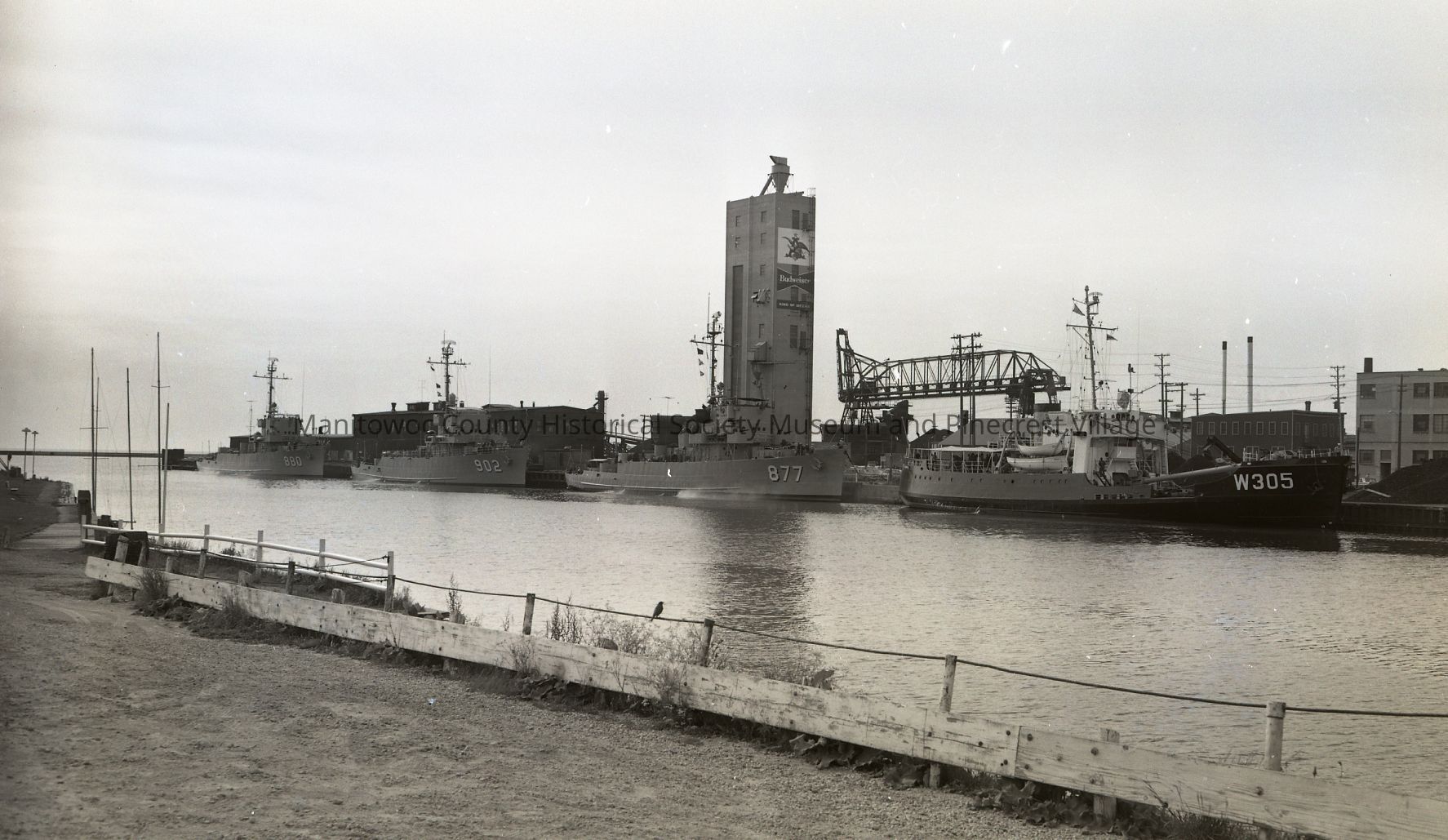 Navy boats W-305, 877, 902, 880 docked along Quay Street. In background is Pauly & Pauly Cheese Co and Rahr malting elevator. Photograph taken in May 1964.Made/Created