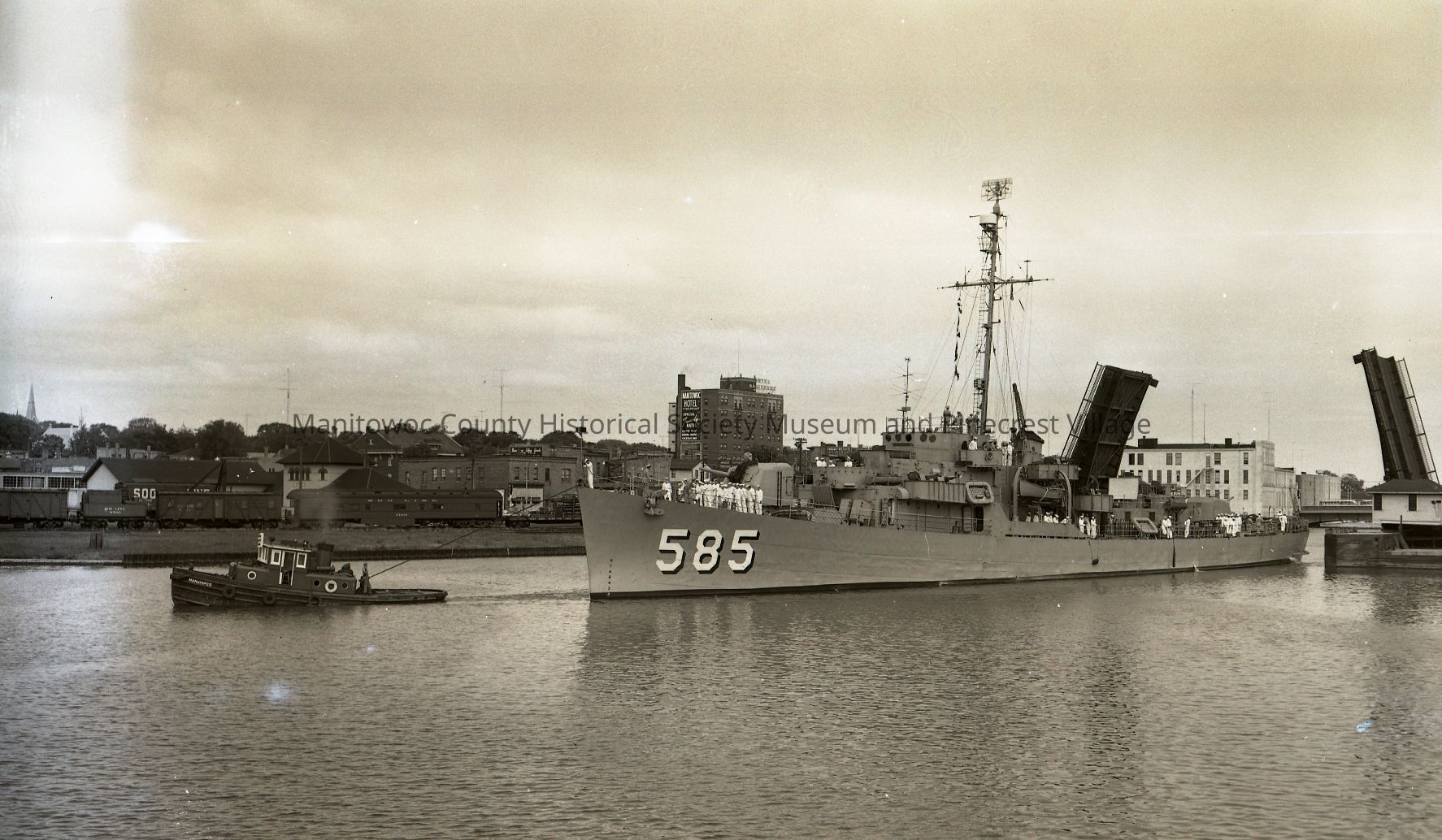 Navy ship 585 being towed up river through 10th Street bridge by tug Manship Co. Photograph taken August 26th, 1954.Made/Created