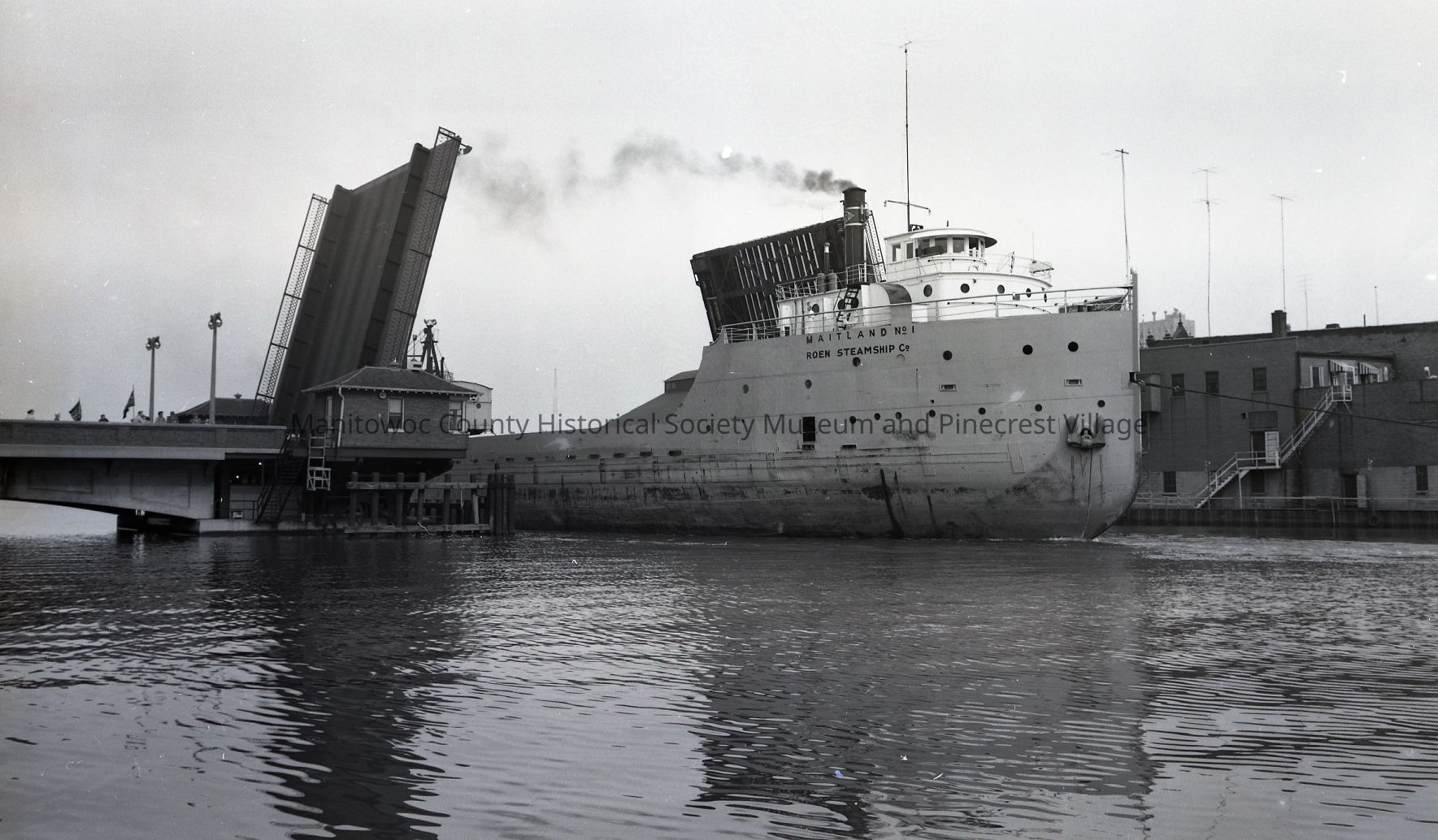 Maitland going up the river through the 8th Street Bridge in Manitowoc. It is an old Toronto-Hamilton & Buffalo carferry. Photograph taken May 12th, 1955.Made/Created