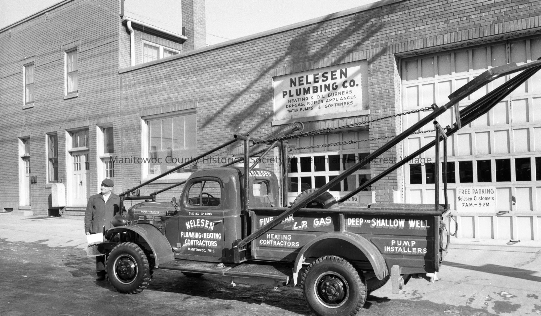 Nelesen Plumbing truck parked in front of their garage, North 9th Street Manitowoc; the store at left is 823 Buffalo Street. Photograph taken on January 30th, 1958.Made/Created