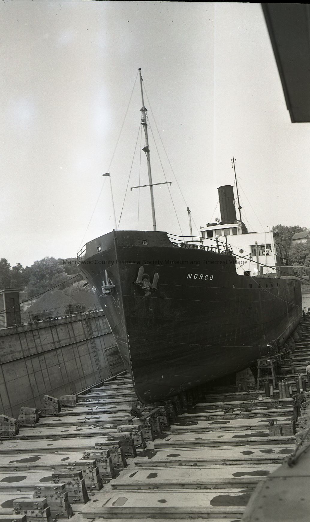 Norco in drydock at Manitowoc Shipbuilding. She hauled pulp wood to the Northern Paper Mill in Green Bay until 1957. Photograph taken July 7th, 1955.