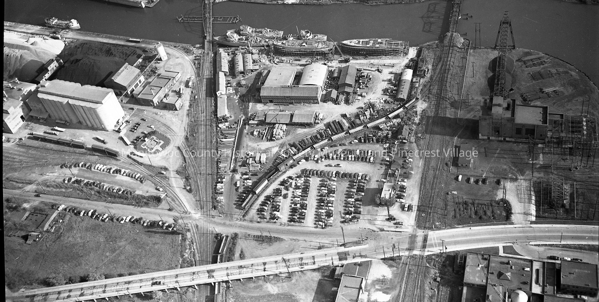 Aerial view of Manitowoc river with Soo Line RR at left ending at carferry slip at North 6th street. At right is C&NW RR line going out to Calumet yards. At top is Manitowoc Shipbuilding; at right is Aluminum Specialty. At center left is Manitowoc Portland Cement; Burger Boat building with minesweeper; right is Wisconsin Public Service and at bottom is North 18th street viaduct.