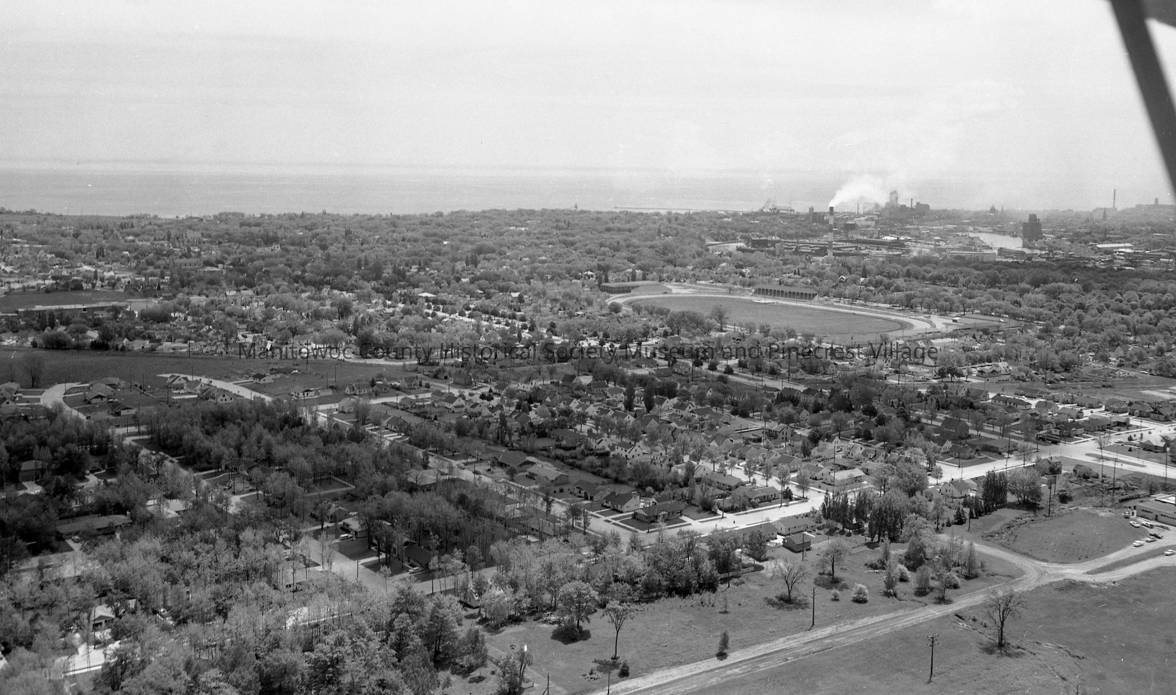 Aerial: North 23rd & 24th Street Manitowoc, north of Waldo Blvd. At center right of photo is Manitowoc County Fairgrounds. At right edge is intersection of Waldo Blvd. and North 23rd street, looking southeast