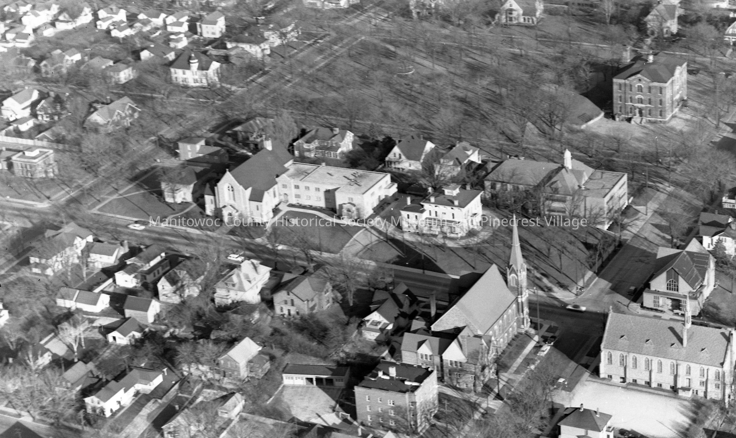 Aerial of North 8th and State Street. Churches at corner are at lower right, St. James Episcopal, 434; to left is First Presbyterian, 502 and kitty corner is the Jewish synagogue, 435 North 8th Street. Going up State street is Sacred Heart Catholic church and school, 702; large building beyond is old Madison School, 610 State Street. Open area to left of school is Union Park. At center of photo is First Lutheran church, 521 North 8th and to right is old Platt home, 507 North 8th Street. Photograph taken on December 1st, 1958.Made/Created