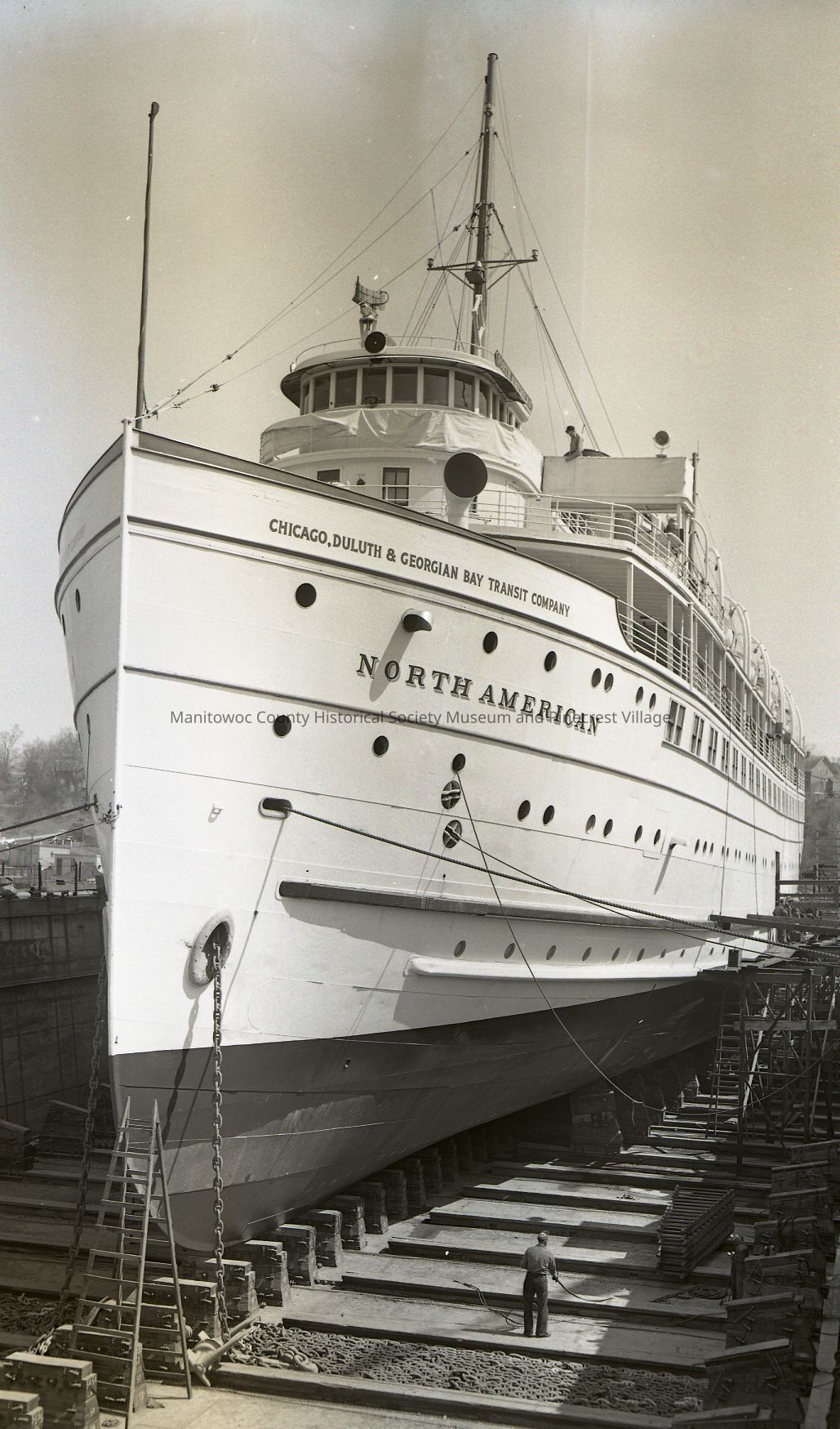 North American in dry dock at Manitowoc Shipbuilding. She was the last of the Great Lakes cruise boats. Photograph taken on April 28th, 1952.Made/Created