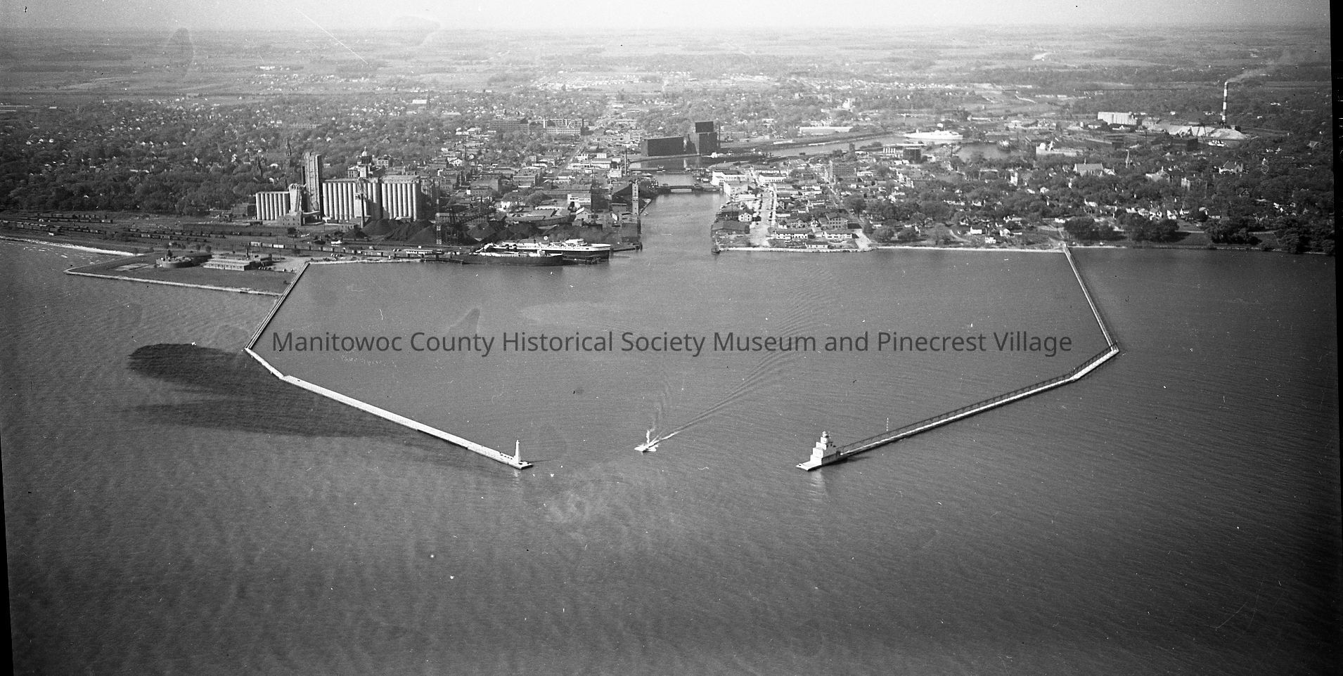 Aerial view of North & South piers looking west into Manitowoc. At left is Sewage Treatment Plant and Rahr Malting with two carferries at their slips.