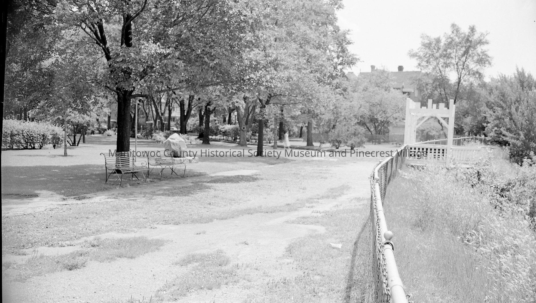 Old Schuette Park on North Water street Manitowoc, looking south from along the river bluff. The structure at right was the overlook stand to look down at the river and Manitowoc Shipbuilding. Circa 1950.Made/Created