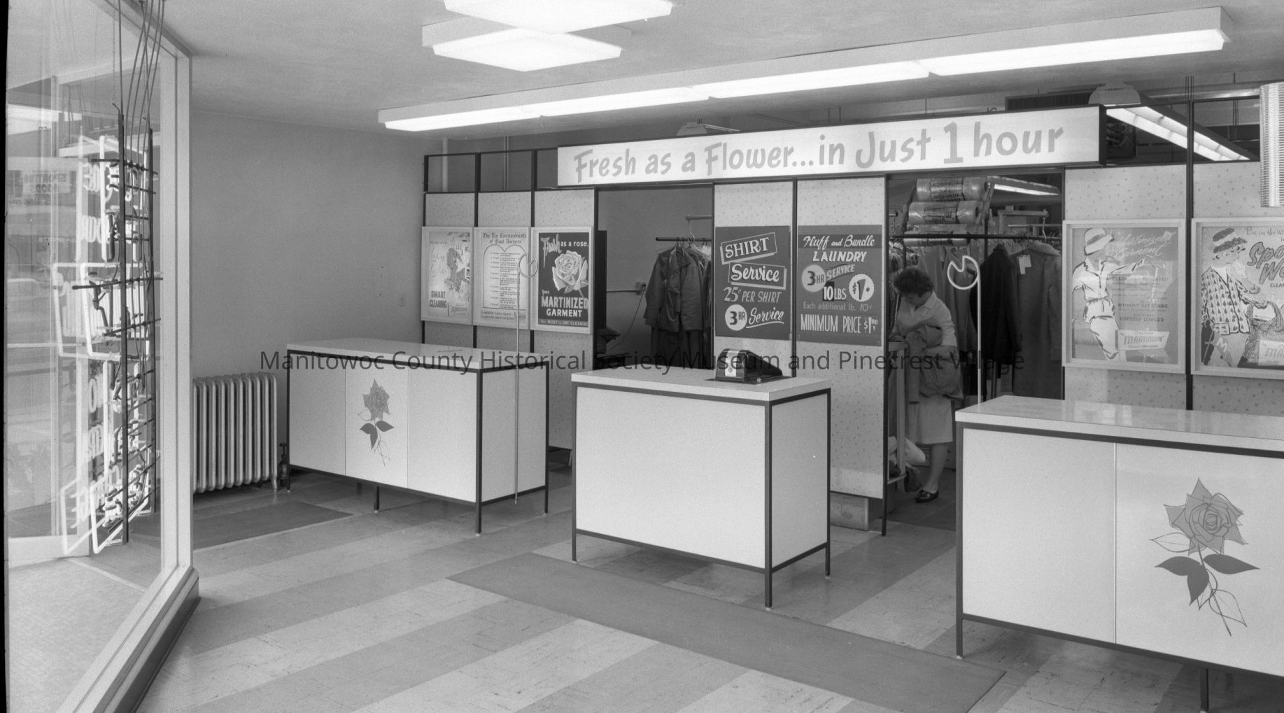 One Hour Martinizing Cleaners, 822 South 8th Street Manitowoc; interior drop-off counter. Photograph taken on April 27th, 1961.Made/Created