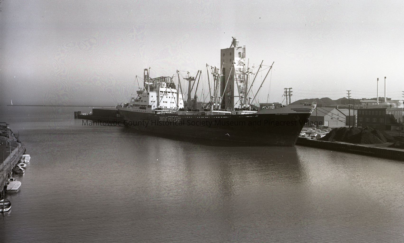 Greek Foreign ship Orient Mariner docked in front of Budweiser elevator on Quay Street in Manitowoc. Photograph taken on October 15th, 1964.Made/Created
