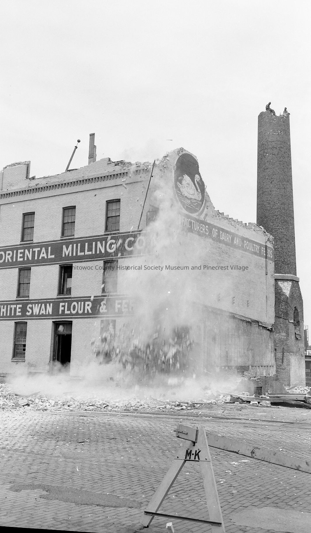Oriental Milling Company, 822 Quay Street Manitowoc coming down with men on top of chimney taking it down brick by brick. Photograph taken on June 14th, 1956.Made/Created