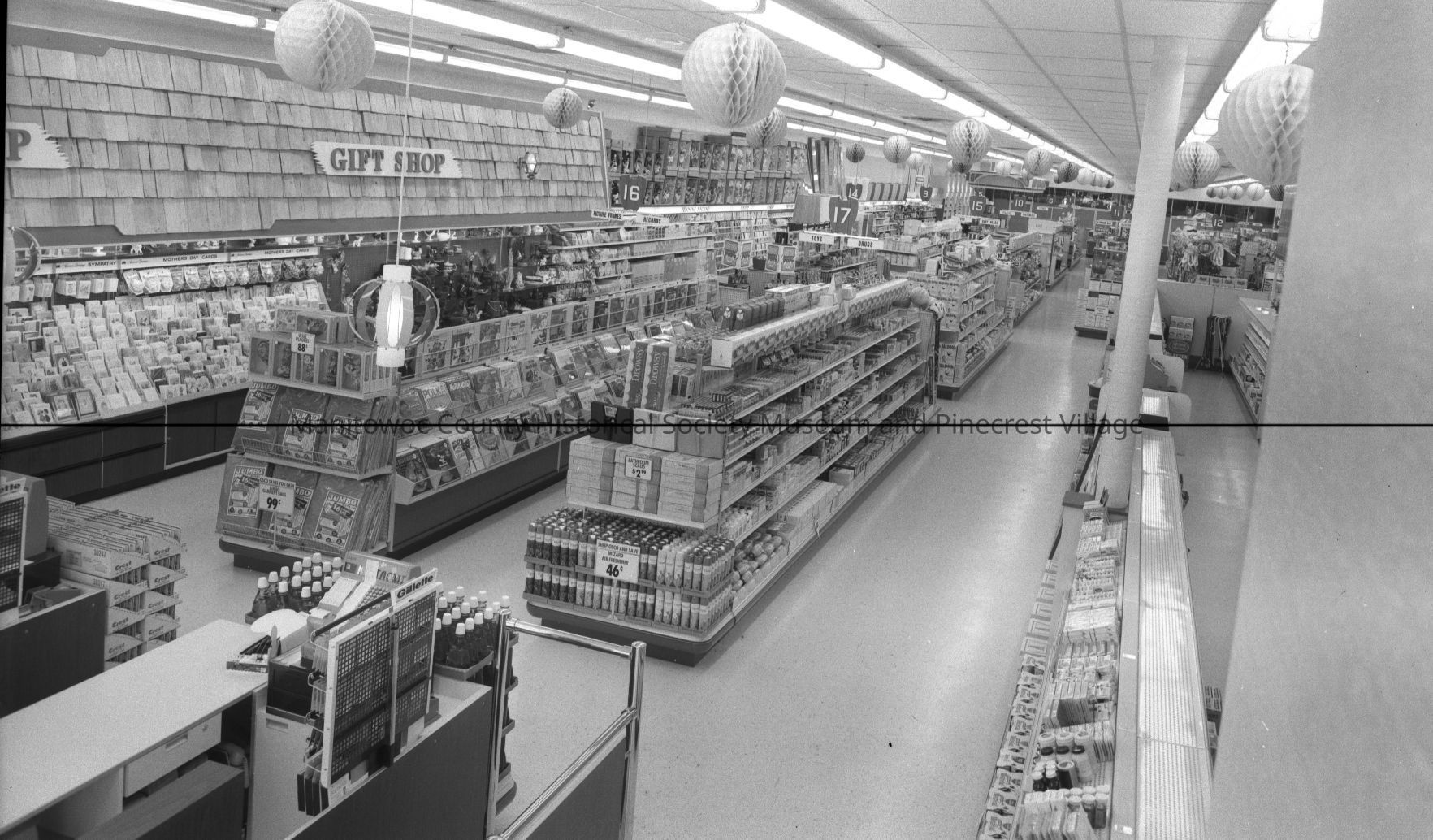 Mid-Cities Mall, 828 Memorial Drive Manitowoc; looking down aisle toward pharmacy at Osco Drug. Photograph taken on April 28th, 1968.Made/Created
