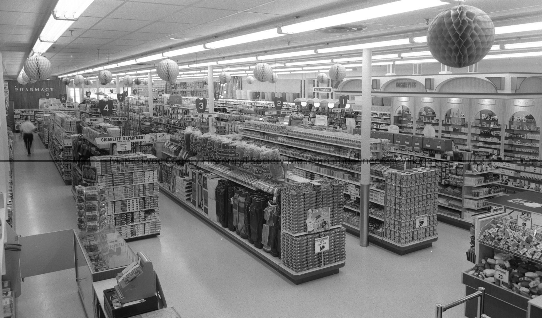 Mid-Cities Mall, 828 Memorial Drive Manitowoc; looking down aisle from check-out at Osco Drug. Photograph taken on April 28th, 1968.Made/Created