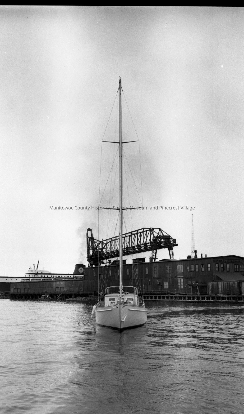 Pandora sailboat in river. Behind is Pauly Cheese Company, 510 Quay Street Manitowoc. Gantry unloader is at C. Reiss Coal Company dock, 509 Jay Street and the City of Midland is docked at carferry slip. Photograph taken on May 3rd, 1958.Made/Created